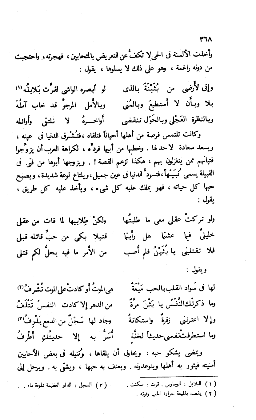 ويمضى يشكو حبه، ويحاول أن يلقاها، وتنيله فى بعض الأحايين أمنيته فيثور به أهلها ويتوعدونه. ويعنف به حبها، ويشقى به. ويرحل إلى