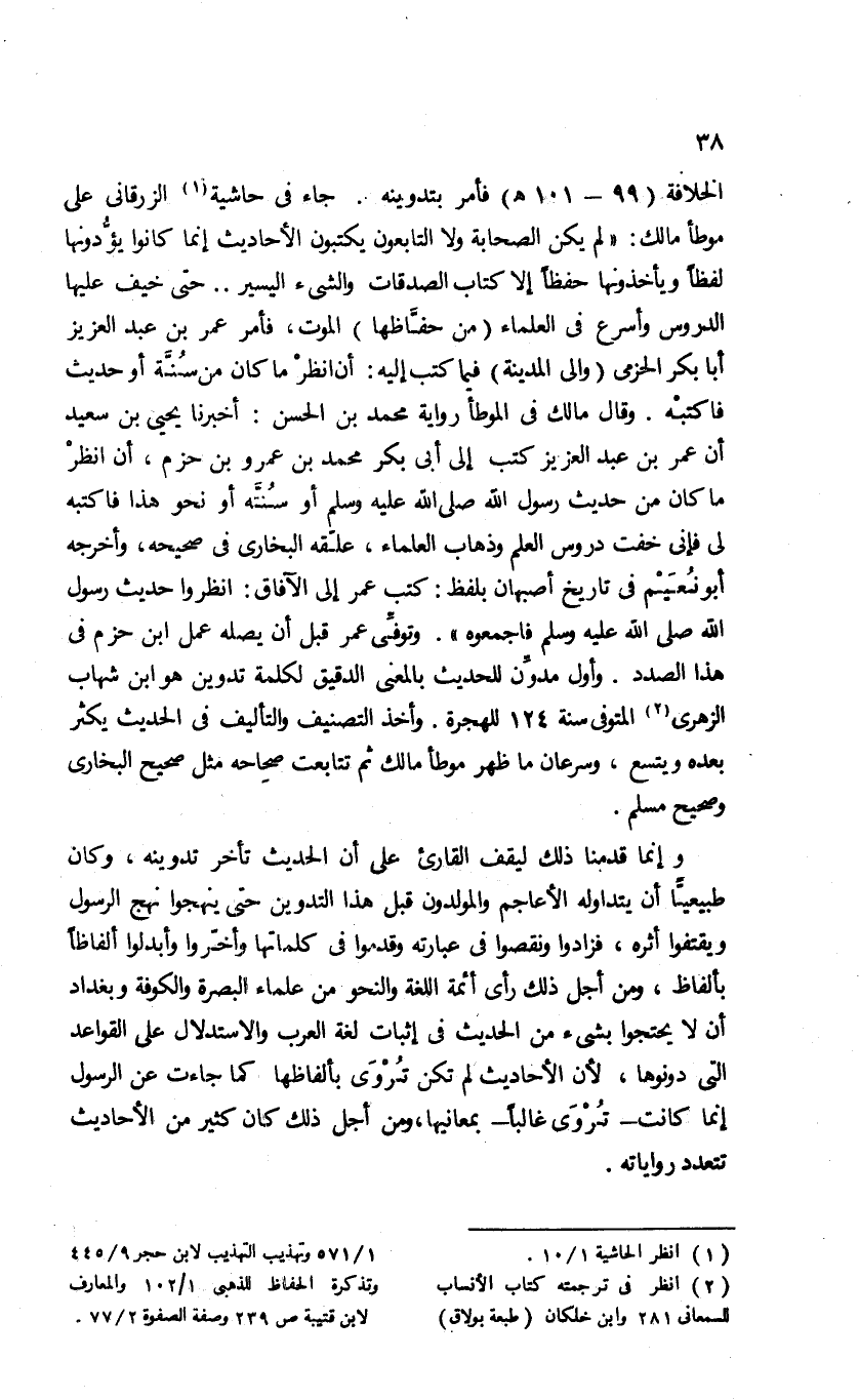 الخلافة (99 - 101 هـ) فأمر بتدوينه. جاء فى حاشية (¬1) الزرقانى على موطأ مالك: «لم يكن الصحابة ولا التابعون يكتبون الأحاديث إنما كانوا يؤدّونها لفظا ويأخذونها حفظا إلا كتاب الصدقات والشئ اليسير. . حتى خيف عليها الدروس وأسرع فى العلماء (من حفّاظها) الموت، فأمر عمر بن عبد العزيز أبا بكر الحزمى (والى المدينة) فيما كتب إليه: أن انظر ما كان من سنّة أو حديث فاكتبه. وقال مالك فى الموطأ رواية محمد بن الحسن: أخبرنا يحيى بن سعيد أن عمر بن عبد العزيز كتب إلى أبى بكر محمد بن عمرو بن حزم، أن انظر ما كان من حديث رسول الله صلى الله عليه وسلم أو سنتّه أو نحو هذا فاكتبه لى فإنى خفت دروس العلم وذهاب العلماء، علّقه البخارى فى صحيحه، وأخرجه أبو نعيم فى تاريخ أصبهان بلفظ: كتب عمر إلى الآفاق: انظروا حديث رسول الله صلى الله عليه وسلم فاجمعوه». وتوفّى عمر قبل أن يصله عمل ابن حزم فى هذا الصدد. وأول مدوّن للحديث بالمعنى الدقيق لكلمة تدوين هو ابن شهاب الزهرى (¬2) المتوفى سنة 124 للهجرة. وأخذ التصنيف والتأليف فى الحديث يكثر بعده ويتسع، وسرعان ما ظهر موطأ مالك ثم تتابعت صحاحه مثل صحيح البخارى وصحيح مسلم.
