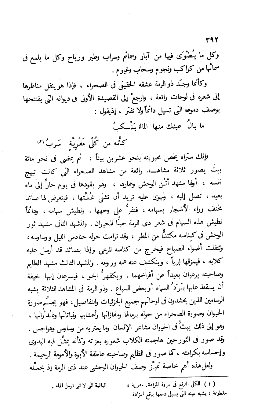 وكأنما وجد ذو الرمة عشقه الحقيقى فى الصحراء، فإذا هو ينقل مناظرها إلى شعره فى لوحات رائعة، وارجع إلى القصيدة الأولى فى ديوانه التى يفتتحها بوصف دموعه التى تسيل دائما ولا تفتر، إذ يقول: