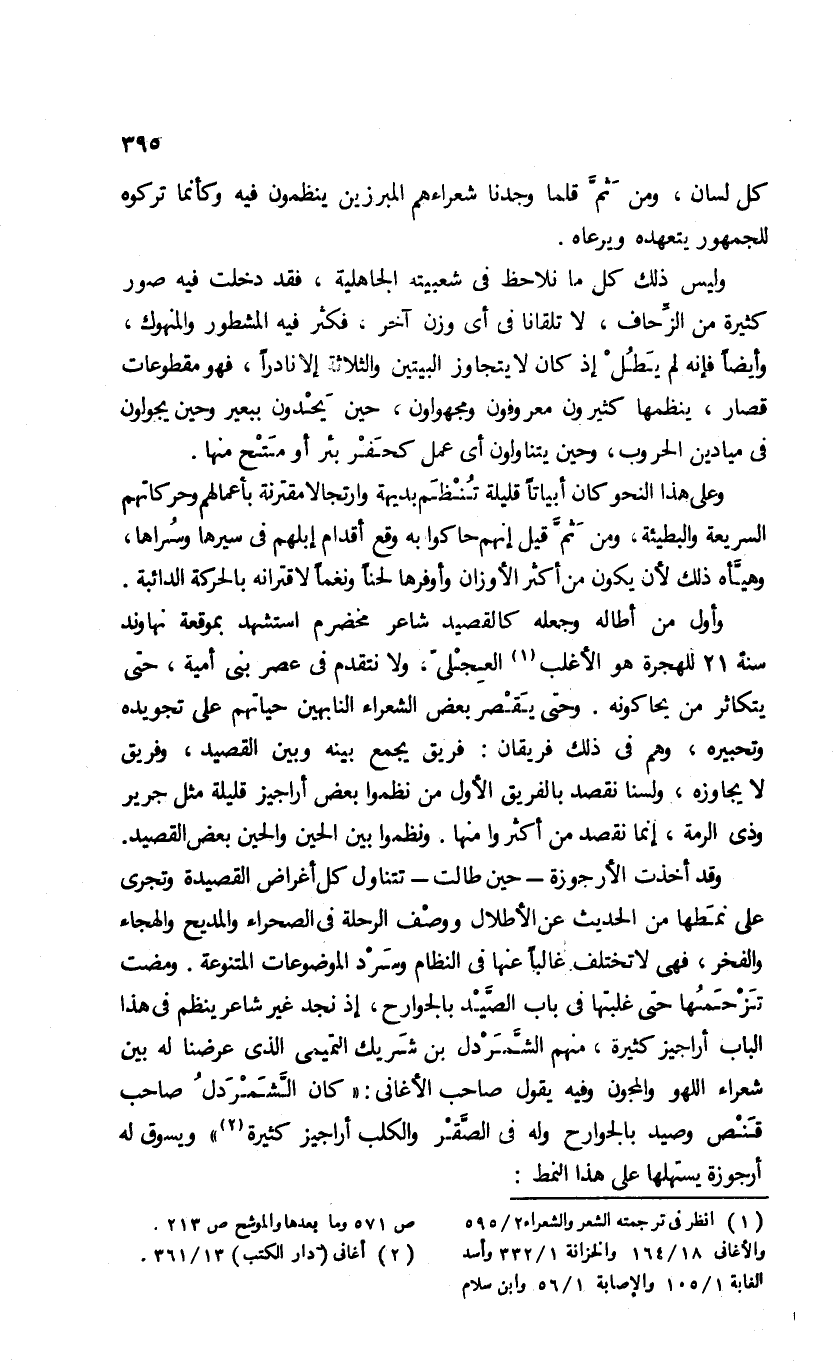 وأول من أطاله وجعله كالقصيد شاعر مخضرم استشهد بموقعة نهاوند سنة 21 للهجرة هو الأغلب (¬1) العجلىّ، ولا نتقدم فى عصر بنى أمية، حتى يتكاثر من يحاكونه. وحتى يقصر بعض الشعراء النابهين حياتهم على تجويده وتحبيره، وهم فى ذلك فريقان: فريق يجمع بينه وبين القصيد، وفريق لا يجاوزه، ولسنا نقصد بالفريق الأول من نظموا بعض أراجيز قليلة مثل جرير وذى الرمة، إنما نقصد من أكثروا منها. ونظموا بين الحين والحين بعض القصيد.