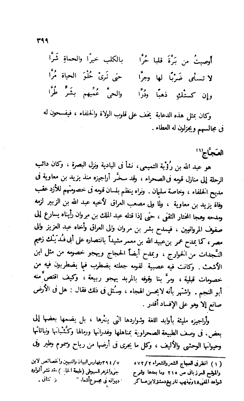 (¬1) انظر فى العجاج الشعر والشعراء 2/ 572 والموشح للمرزبانى ص 215 وما بعدها وشرح شواهد المغنى 18 وتهذيب تاريخ دمشق لابن عساكر 7/ 394 وفهارس البيان والتبيين والخصائص لابن جنى والمزهر للسيوطى (طبعة الحلبى) وقد نشر ألوارد ديوانه فى مجموع أشعار العرب، الجزء الثانى.
