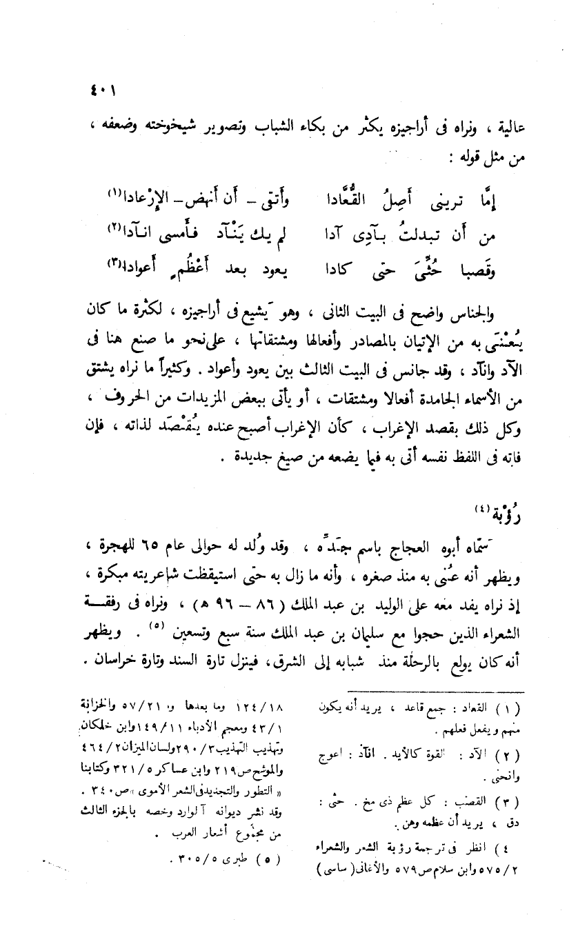 والجناس واضح فى البيت الثانى، وهو يشيع فى أراجيزه، لكثرة ما كان يعنى به من الإتيان بالمصادر وأفعالها ومشتقاتها، على نحو ما صنع هنا فى الآد وانآد، وقد جانس فى البيت الثالث بين يعود وأعواد. وكثيرا ما نراه يشتق من الأسماء الجامدة أفعالا ومشتقات، أو يأتى ببعض المزيدات من الحروف، وكل ذلك بقصد الإغراب، كأن الإغراب أصبح عنده يقصد لذاته، فإن فاته فى اللفظ نفسه أتى به فيما يضعه من صيغ جديدة.