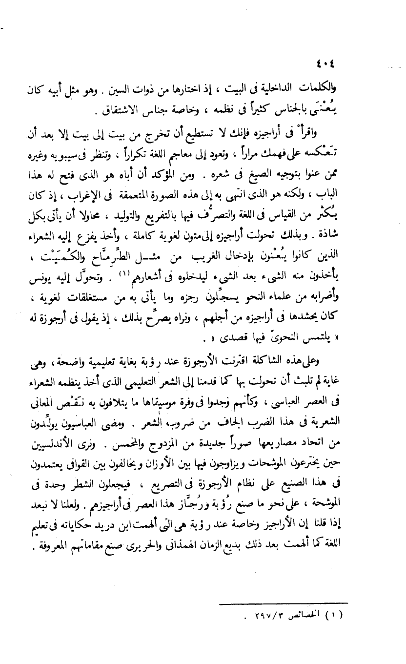 وعلى هذه الشاكلة اقترنت الأرجوزة عند رؤبة بغاية تعليمية واضحة، وهى غاية لم تلبث أن تحولت بها كما قدمنا إلى الشعر التعليمى الذى أخذ ينظمه الشعراء فى العصر العباسى، وكأنهم وجدوا فى وفرة موسيقاها ما يتلافون به نقص المعانى الشعرية فى هذا الضرب الجاف من ضروب الشعر. ومضى العباسيون يولّدون من اتحاد مصاريعها صورا جديدة من المزدوج والمخمس. ونرى الأندلسيين حين يخترعون الموشحات ويزاوجون فيها بين الأوزان ويخالفون بين القوافى يعتمدون فى هذا الصنيع على نظام الأرجوزة فى التصريع، فيجعلون الشطر وحدة فى الموشحة، على نحو ما صنع رؤبة ورجّاز هذا العصر فى أراجيزهم. ولعلنا لا نبعد إذا قلنا إن الأراجيز وخاصة عند رؤبة هى التى ألهمت ابن دريد حكاياته فى تعليم اللغة كما ألهمت بعد ذلك بديع الزمان الهمذانى والحريرى صنع مقاماتهم المعروفة.