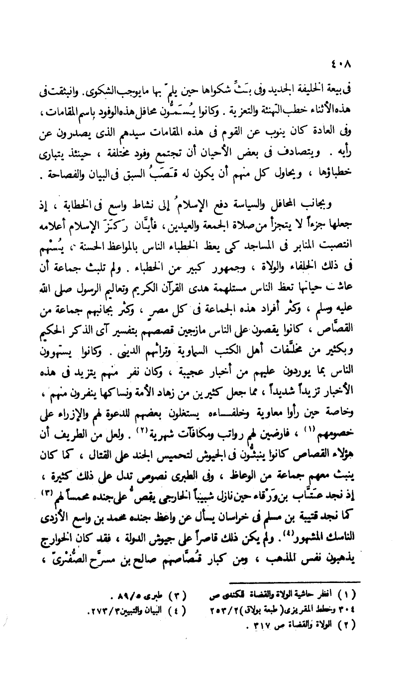 وبجانب المحافل والسياسة دفع الإسلام إلى نشاط واسع فى الخطابة، إذ جعلها جزءا لا يتجزأ من صلاة الجمعة والعيدين، فأيّان ركز الإسلام أعلامه انتصبت المنابر فى المساجد كى يعظ الخطباء الناس بالمواعظ الحسنة، يسهم فى ذلك الخلفاء والولاة، وجمهور كبير من الخطباء. ولم تلبث جماعة أن عاشت حياتها تعظ الناس مستلهمة هدى القرآن الكريم وتعاليم الرسول صلى الله عليه وسلم، وكثر أفراد هذه الجماعة فى كل مصر، وكثر بجانبهم جماعة من القصّاص، كانوا يقصون على الناس مازجين قصصهم بتفسير آى الذكر الحكيم وبكثير من مخلّفات أهل الكتب السماوية وتراثهم الدينى. وكانوا يستهوون الناس بما يوردون عليهم من أخبار عجيبة، وكان نفر منهم يتزيد فى هذه الأخبار تزيدا شديدا، مما جعل كثيرين من زهاد الأمة ونساكها ينفرون منهم، وخاصة حين رأوا معاوية وخلفاءه يستغلون بعضهم للدعوة لهم والإزراء على خصومهم (¬1)، فارضين لهم رواتب ومكافآت شهرية (¬2). ولعل من الطريف أن هؤلاء القصاص كانوا ينبثّون فى الجيوش لتحميس الجند على القتال، كما كان ينبث معهم جماعة من الوعاظ، وفى الطبرى نصوص تدل على ذلك كثيرة، إذ نجد عتّاب بن ورقاء حين نازل شبيبا الخارجى يقصّ على جنده محمسا لهم (¬3) كما نجد قتيبة بن مسلم فى خراسان يسأل عن واعظ جنده محمد بن واسع الأزدى الناسك المشهور (¬4). ولم يكن ذلك قاصرا على جيوش الدولة، فقد كان الخوارج يذهبون نفس المذهب، ومن كبار قصّاصهم صالح بن مسرّح الصّفرىّ،