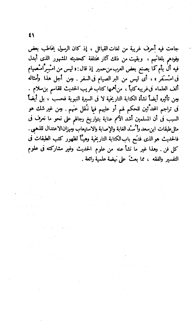 فالحديث هو الذى فتح باب الكتابة التاريخية وهيّأ لظهور كتب الطبقات فى كل فن. وهذا غير ما نشأ عنه من علوم الحديث وغير مشاركته فى علوم التفسير والفقه، مما بعث على نهضة علمية رائعة.