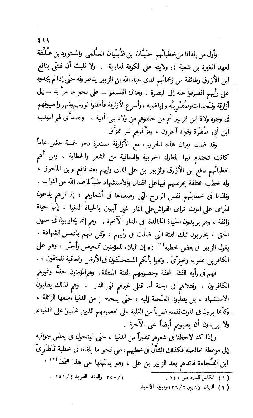وأول من يلقانا من خطبائهم حيّان بن ظبيان السّلمى والمستورد بن علّفة لعهد المغيرة بن شعبة فى ولايته على الكوفة لمعاوية. ولا نلبث أن نلتقى بنافع ابن الأزرق وطائفة من زعمائهم لدى عبد الله بن الزبير يناظرونه حتى إذا لم يجدوه على رأيهم انصرفوا عنه إلى البصرة، وهناك انقسموا-على نحو ما مرّ بنا-إلى أزارقة ونجدات وصفريّة وإباضية، وأسرع الأزارقة فأعلنوا ثورتهم وشهروا سيوفهم فى وجوه ولاة ابن الزبير ثم من خلفوهم من ولاة بنى أمية، وتصدّى لهم المهلب ابن أبى صفرة وقواد آخرون، ومزّقوهم شر ممزّق.
