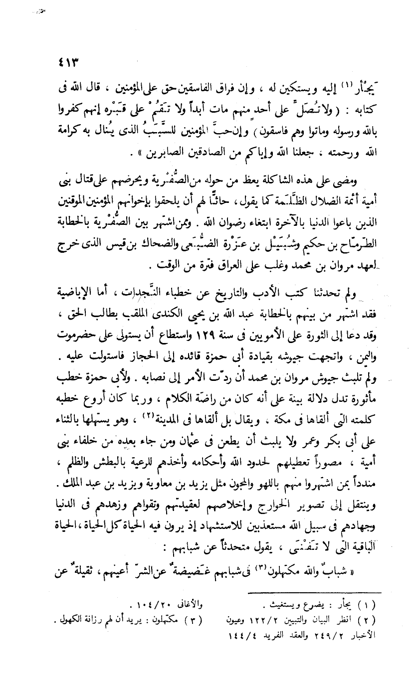ولم تلبث جيوش مروان بن محمد أن ردّت الأمر إلى نصابه. ولأبى حمزة خطب مأثورة تدل دلالة بينة على أنه كان من راضة الكلام، وربما كان أروع خطبه كلمته التى ألقاها فى مكة، ويقال بل ألقاها فى المدينة (¬2)، وهو يستهلها بالثناء على أبى بكر وعمر ولا يلبث أن يطعن فى عثمان ومن جاء بعده من خلفاء بنى أمية، مصورا تعطيلهم لحدود الله وأحكامه وأخذهم للرعية بالبطش والظلم، منددا بمن اشتهروا منهم باللهو والمجون مثل يزيد بن معاوية ويزيد بن عبد الملك.