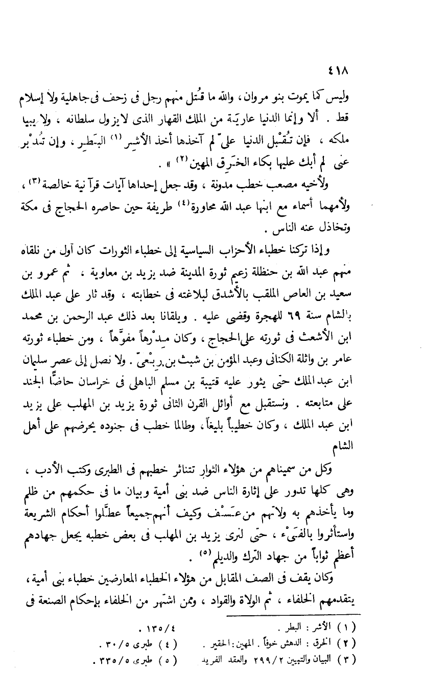 وكل من سميناهم من هؤلاء الثوار تتناثر خطبهم فى الطبرى وكتب الأدب، وهى كلها تدور على إثارة الناس ضد بنى أمية وبيان ما فى حكمهم من ظلم وما يأخذهم به ولاتهم من عسف وكيف أنهم جميعا عطّلوا أحكام الشريعة واستأثروا بالفئ، حتى لنرى يزيد بن المهلب فى بعض خطبه يجعل جهادهم أعظم ثوابا من جهاد الترك والديلم (¬5).