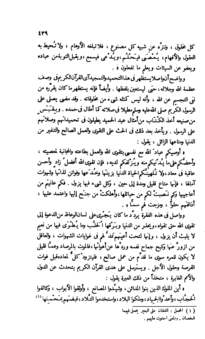 وواضح أن واصلا يستظهر فى هذا التحميد والتمجيد آى القرآن الكريم فى وصف عظمة الله وجلاله، حتى ليستعين بلفظها. وأيضا فإنه يستظهر ما كان يقرّره من نفى التجسيم عن الله، وأنه ليس كمثله شئ من مخلوقاته. وقد مضى يصلى على الرسول الكريم صلى الله عليه وسلم مطيلا فى صلاته كما أطال فى حمده. وبقبس من صنيعه أخذ الكتّاب من أمثال عبد الحميد يطيلون فى تحميداتهم وصلاتهم على الرسول. ويأخذ بعد ذلك فى الحث على التقوى والعمل الصالح والتنفير من الدنيا ومتاعها الزائل، يقول: