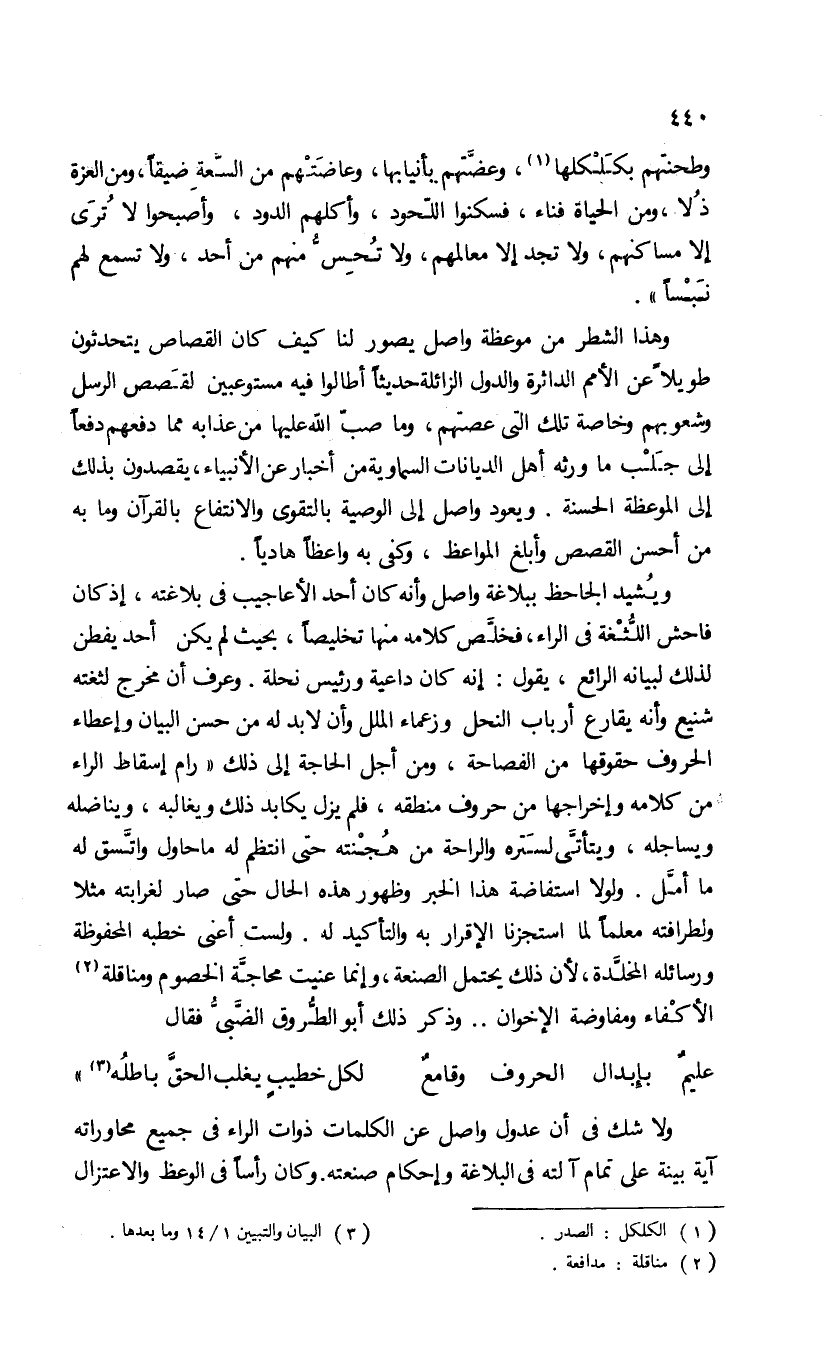 ولا شك فى أن عدول واصل عن الكلمات ذوات الراء فى جميع محاوراته آية بينة على تمام آلته فى البلاغة وإحكام صنعته. وكان رأسا فى الوعظ والاعتزال