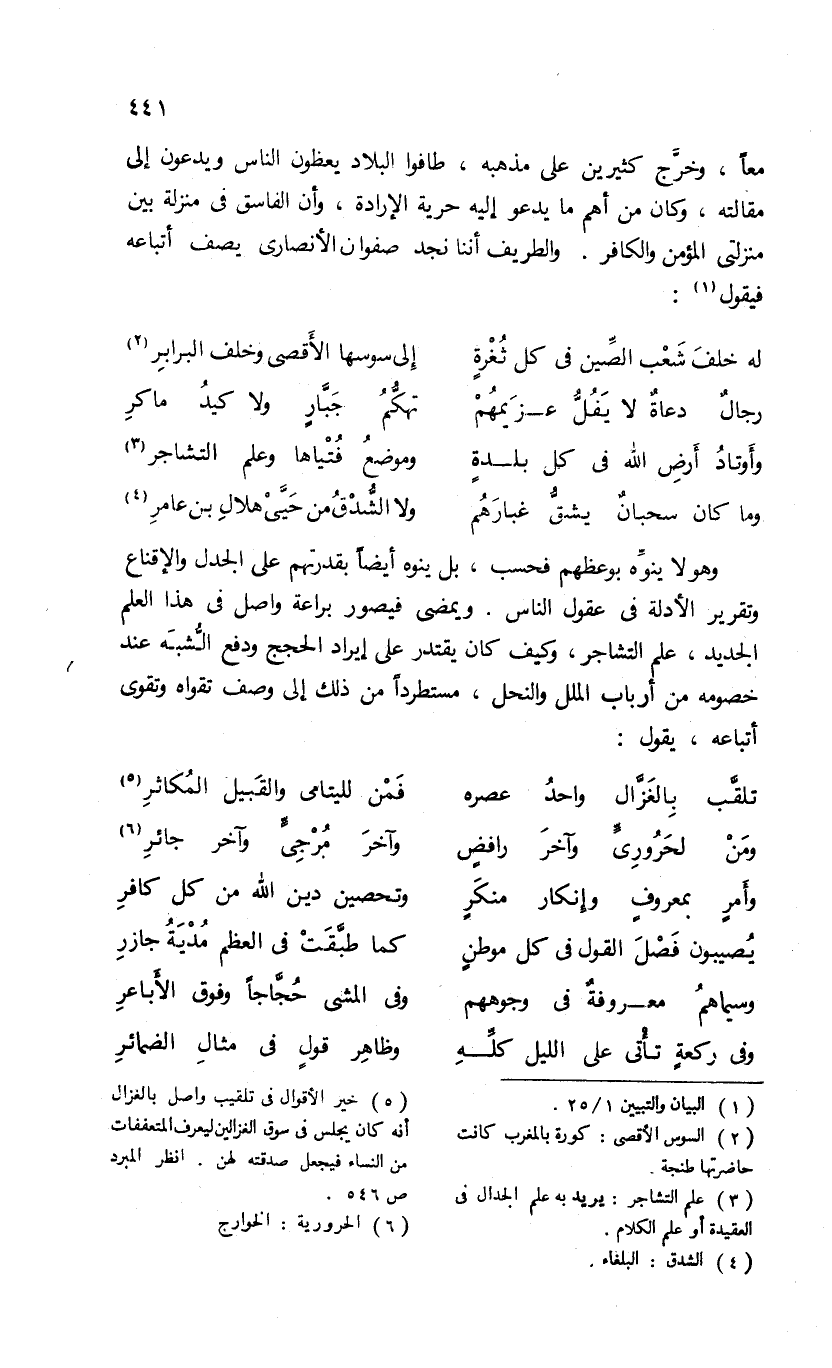 وهو لا ينوّه بوعظهم فحسب، بل ينوه أيضا بقدرتهم على الجدل والإقناع وتقرير الأدلة فى عقول الناس. ويمضى فيصور براعة واصل فى هذا العلم الجديد، علم التشاجر، وكيف كان يقتدر على إيراد الحجج ودفع الشّبه عند خصومه من أرباب الملل والنحل، مستطردا من ذلك إلى وصف تقواه وتقوى أتباعه، يقول: