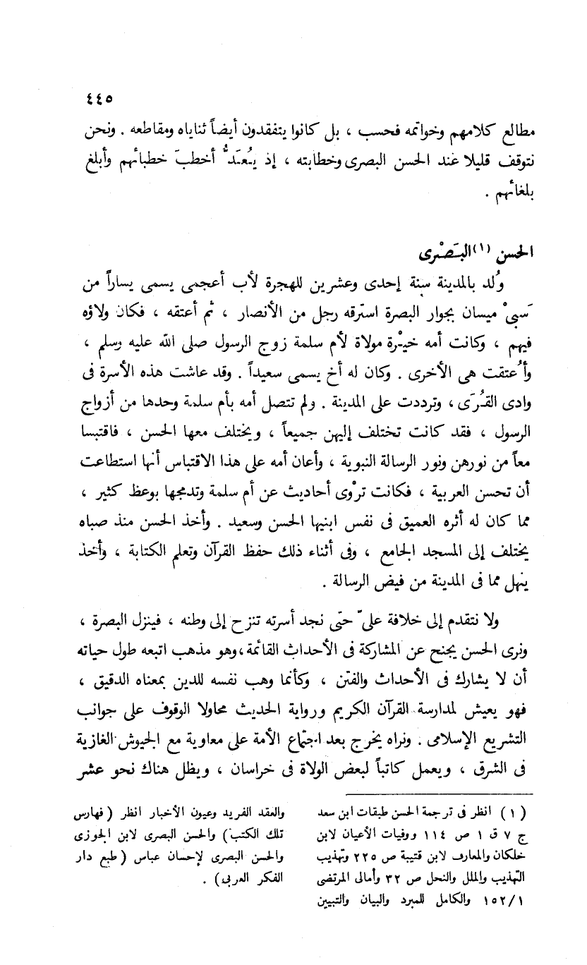 (¬1) انظر فى ترجمة الحسن طبقات ابن سعد ج 7 ق 1 ص 114 ووفيات الأعيان لابن خلكان والمعارف لابن قتيبة ص 225 وتهذيب التهذيب والملل والنحل ص 32 وأمالى المرتضى 1/ 152 والكامل للمبرد والبيان والتبيين والعقد الفريد وعيون الأخبار انظر (فهارس تلك الكتب) والحسن البصرى لابن الجوزى والحسن البصرى لإحسان عباس (طبع دار الفكر العربى).