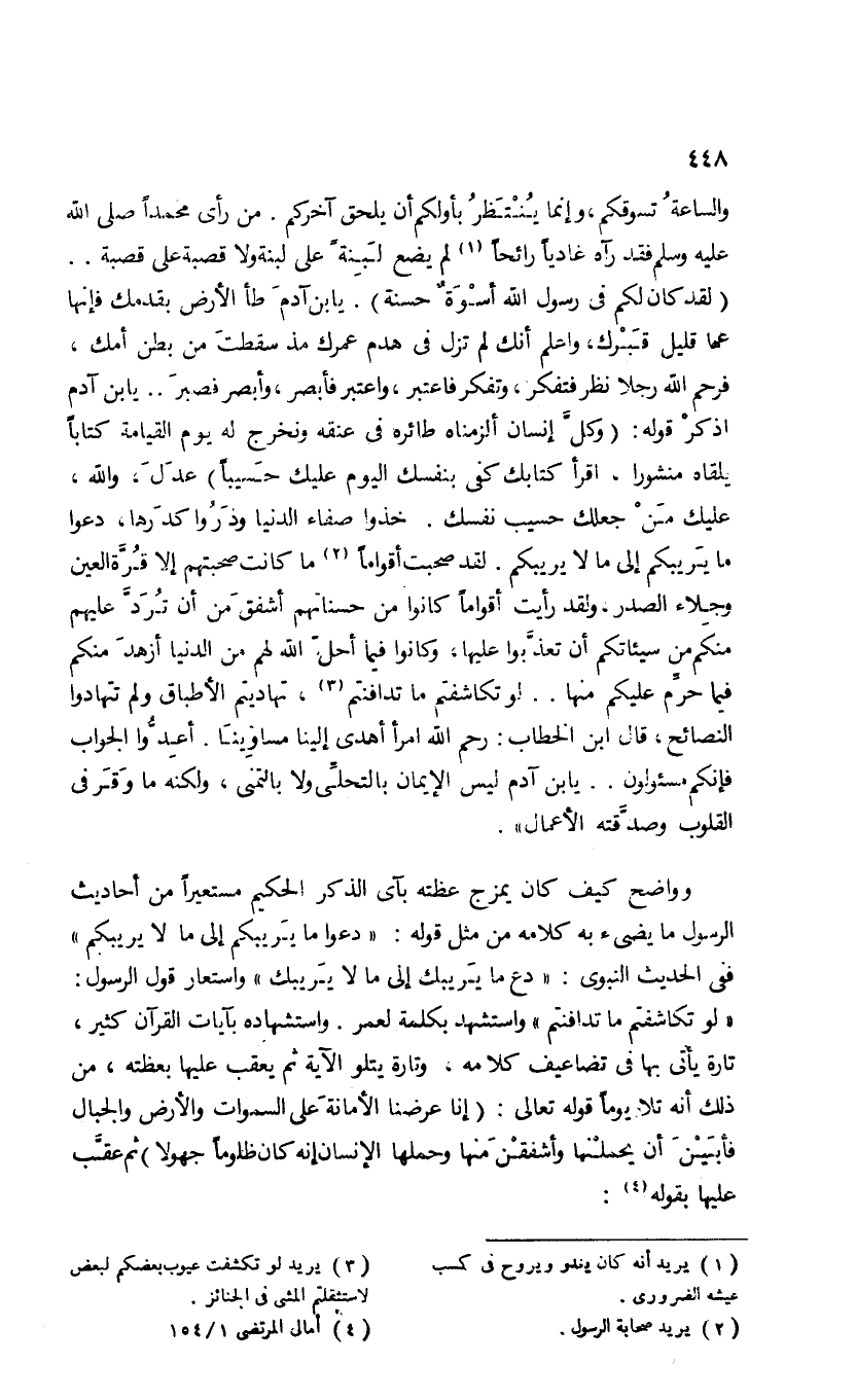 وواضح كيف كان يمزج عظته بآى الذكر الحكيم مستعيرا من أحاديث الرسول ما يضئ به كلامه من مثل قوله: «دعوا ما يريبكم إلى ما لا يريبكم» ففى الحديث النبوى: «دع ما يريبك إلى ما لا يريبك» واستعار قول الرسول: