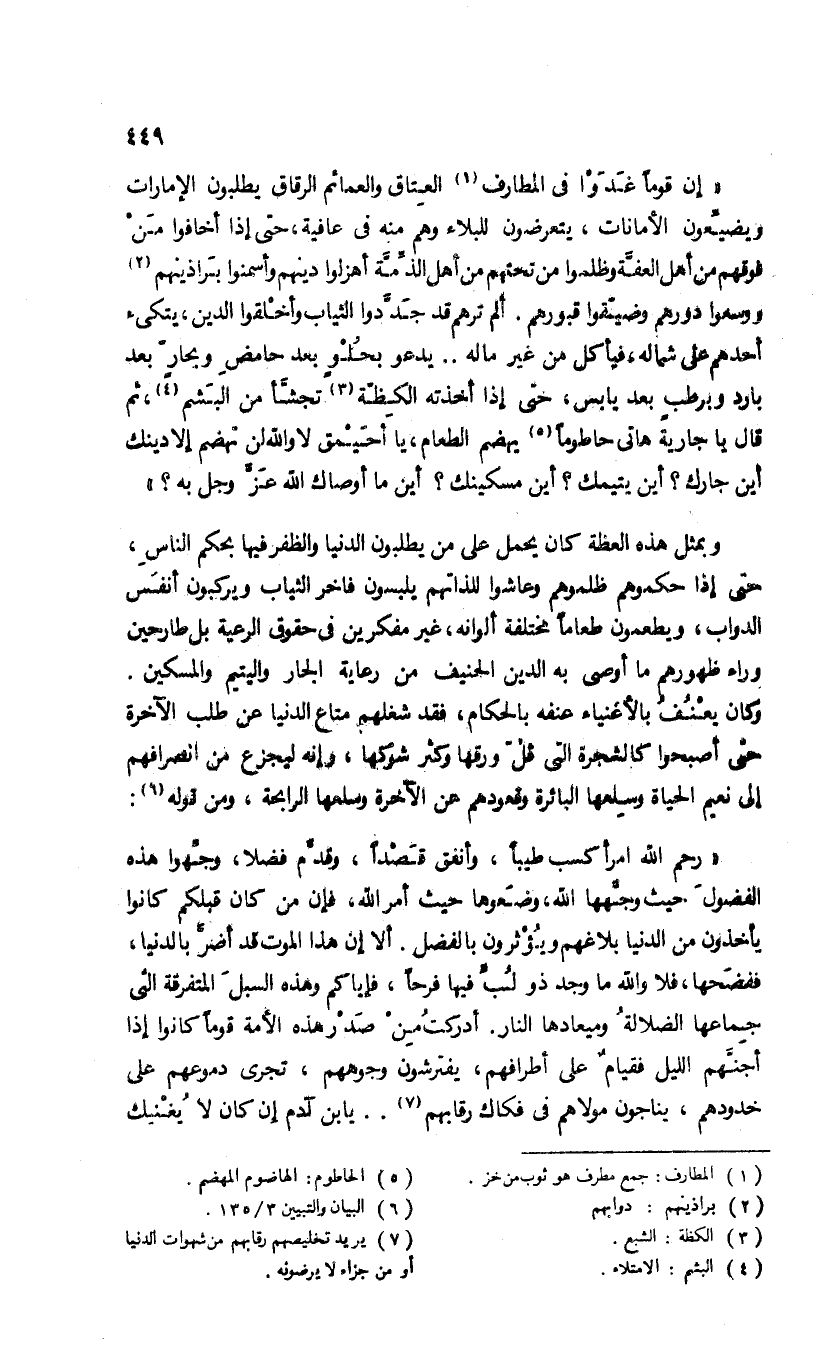 «إن قوما غدوا فى المطارف (¬1) العتاق والعمائم الرقاق يطلبون الإمارات ويضيّعون الأمانات، يتعرضون للبلاء وهم منه فى عافية، حتى إذا أخافوا من فوقهم من أهل العفّة وظلموا من تحتهم من أهل الذّمّة أهزلوا دينهم وأسمنوا براذينهم (¬2) ووسعوا دورهم وضيّقوا قبورهم. ألم ترهم قد جدّدوا الثياب وأخلقوا الدين، يتكئ أحدهم على شماله، فيأكل من غير ماله. . يدعو بحلو بعد حامض وبحارّ بعد بارد وبرطب بعد يابس، حتى إذا أخذته الكظّة (¬3) تجشّأ من البشم (¬4)، ثم قال يا جارية هاتى حاطوما (¬5) يهضم الطعام، يا أحيمق لا والله لن تهضم إلا دينك أين جارك؟ أين يتيمك؟ أين مسكينك؟ أين ما أوصاك الله عزّ وجل به؟ »