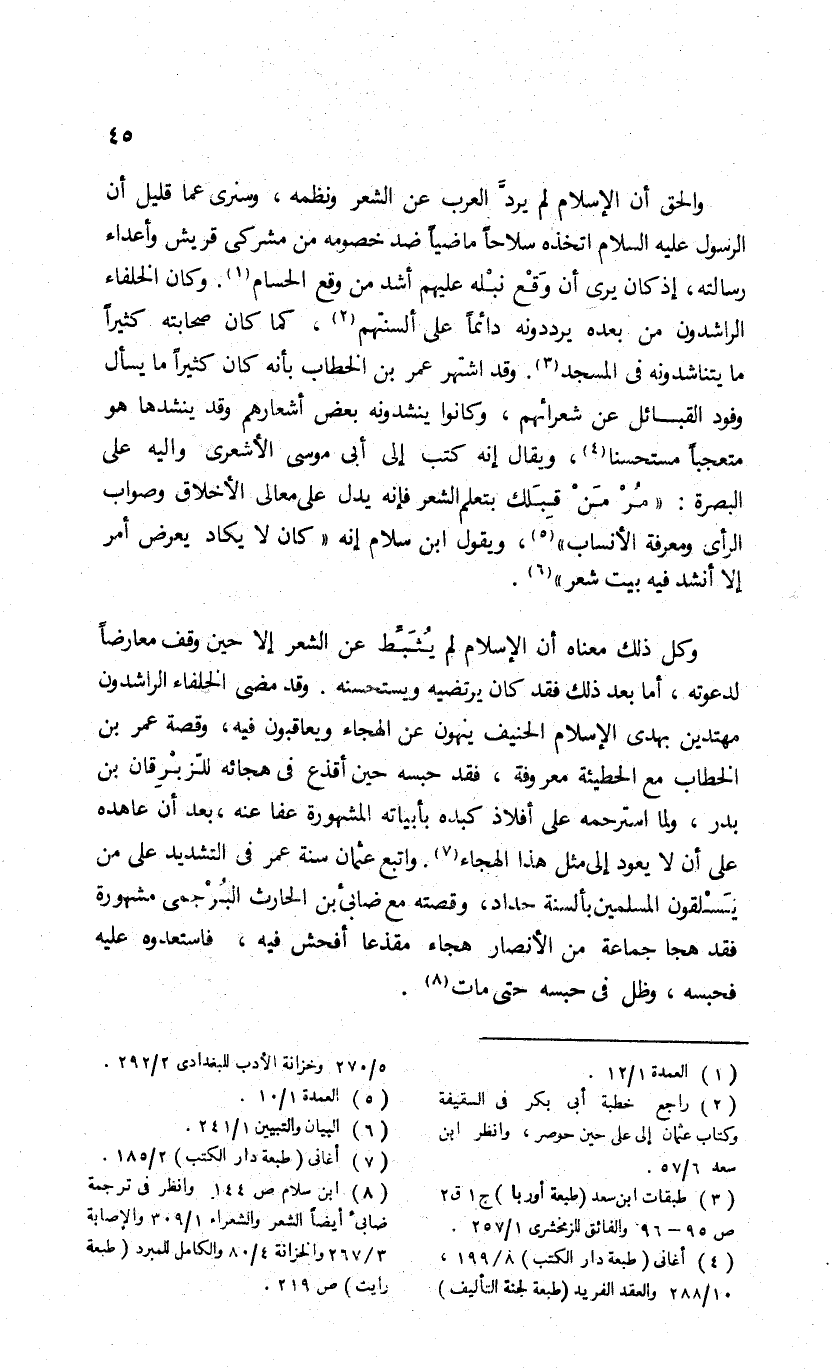 والحق أن الإسلام لم يردّ العرب عن الشعر ونظمه، وسنرى عما قليل أن الرسول عليه السلام اتخذه سلاحا ماضيا ضد خصومه من مشركى قريش وأعداء رسالته، إذ كان يرى أن وقع نبله عليهم أشد من وقع الحسام (¬1). وكان الخلفاء الراشدون من بعده يرددونه دائما على ألسنتهم (¬2)، كما كان صحابته كثيرا ما يتناشدونه فى المسجد (¬3). وقد اشتهر عمر بن الخطاب بأنه كان كثيرا ما يسأل وفود القبائل عن شعرائهم، وكانوا ينشدونه بعض أشعارهم وقد ينشدها هو متعجبا مستحسنا (¬4)، ويقال إنه كتب إلى أبى موسى الأشعرى واليه على البصرة: «مر من قبلك بتعلم الشعر فإنه يدل على معالى الأخلاق وصواب الرأى ومعرفة الأنساب» (¬5)، ويقول ابن سلام إنه «كان لا يكاد يعرض أمر إلا أنشد فيه بيت شعر» (¬6).