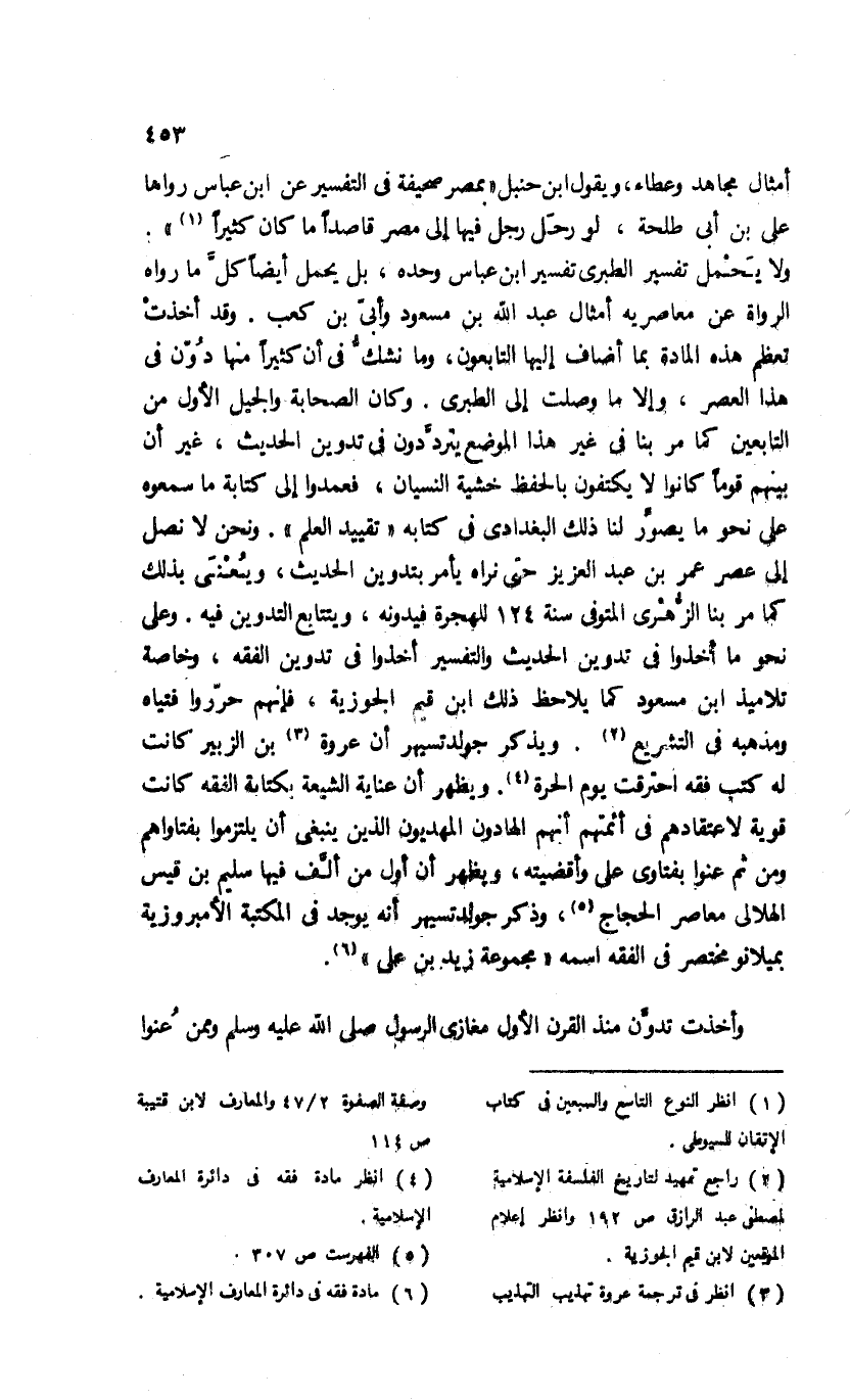 ولا يحمل تفسير الطبرى تفسير ابن عباس وحده، بل يحمل أيضا كلّ ما رواه الرواة عن معاصريه أمثال عبد الله بن مسعود وأبىّ بن كعب. وقد أخذت تعظم هذه المادة بما أضاف إليها التابعون، وما نشكّ فى أن كثيرا منها دوّن فى هذا العصر، وإلا ما وصلت إلى الطبرى. وكان الصحابة والجيل الأول من التابعين كما مر بنا فى غير هذا الموضع يتردّدون فى تدوين الحديث، غير أن بينهم قوما كانوا لا يكتفون بالحفظ خشية النسيان، فعمدوا إلى كتابة ما سمعوه على نحو ما يصوّر لنا ذلك البغدادى فى كتابه «تقييد العلم». ونحن لا نصل إلى عصر عمر بن عبد العزيز حتى نراه يأمر بتدوين الحديث، ويعنى بذلك كما مر بنا الزّهرى المتوفى سنة 124 للهجرة فيدونه، ويتتابع التدوين فيه. وعلى نحو ما أخذوا فى تدوين الحديث والتفسير أخذوا فى تدوين الفقه، وخاصة تلاميذ ابن مسعود كما يلاحظ ذلك ابن قيم الجوزية، فإنهم حرّروا فتياه ومذهبه فى التشريع (¬2). ويذكر جولد تسيهر أن عروة (¬3) بن الزبير كانت له كتب فقه احترقت يوم الحرة (¬4). ويظهر أن عناية الشيعة بكتابة الفقه كانت قوية لاعتقادهم فى أئمتهم أنهم الهادون المهديون الذين ينبغى أن يلتزموا بفتاواهم ومن ثم عنوا بفتاوى على وأقضيته، ويظهر أن أول من ألّف فيها سليم بن قيس الهلالى معاصر الحجاج (¬5)، وذكر جولد تسيهر أنه يوجد فى المكتبة الأمبروزية بميلانو مختصر فى الفقه اسمه «مجموعة زيد بن على» (¬6).