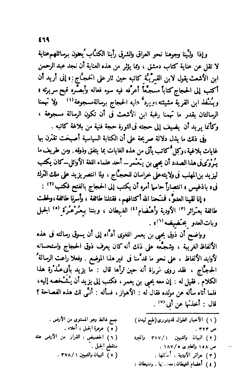 وفى ذلك ما يدل دلالة صريحة على أن الكتابة السياسية أصبحت تقترن بها غايات بلاغية، وكلّ كاتب يأتى من هذه الغايات بما يتفق وذوقه. ومن طريف ما يروى فى هذا الصدد أن يحيى بن يعمر-أحد علماء اللغة الأوائل-كان يكتب ليزيد بن المهلب فى ولايته على خراسان للحجّاج، ولما انتصر يزيد على ملك الترك فى «باذغيس» انتصارا حاسما أمره أن يكتب إلى الحجاج بالفتح فكتب (¬2):
