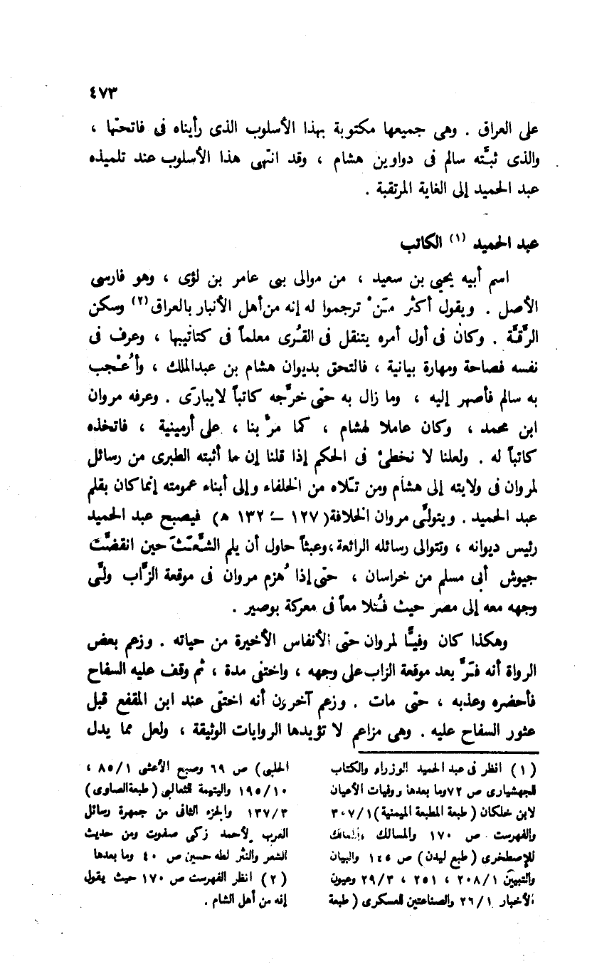 (¬1) انظر فى عبد الحميد الوزراء والكتاب للجهشيارى ص 72 وما بعدها ووفيات الأعيان لابن خلكان؟ ؟ ؟ الميمنية) 1/ 307 والفهرست ص؟ ؟ ؟ والمسالك والممالك للإصطخرى؟ ؟ ؟ ص 145 والبيان والتبيين 1/ 8؟ ؟ ؟ ، 251، 3/ 29 وعيون الأخبار 1/ 26 والصناعتين للمسكرى (طبعة الحلبى) ص 69 وصبح الأعشى 1/ 85، 10/ 195 واليتيمة للثعالبى (طبعة الصاوى) 3/ 137 والجزء الثانى من جمهرة رسائل العرب لأحمد زكى صفوت ومن حديث الشعر والنثر لطه حسين ص 40 وما بعدها.