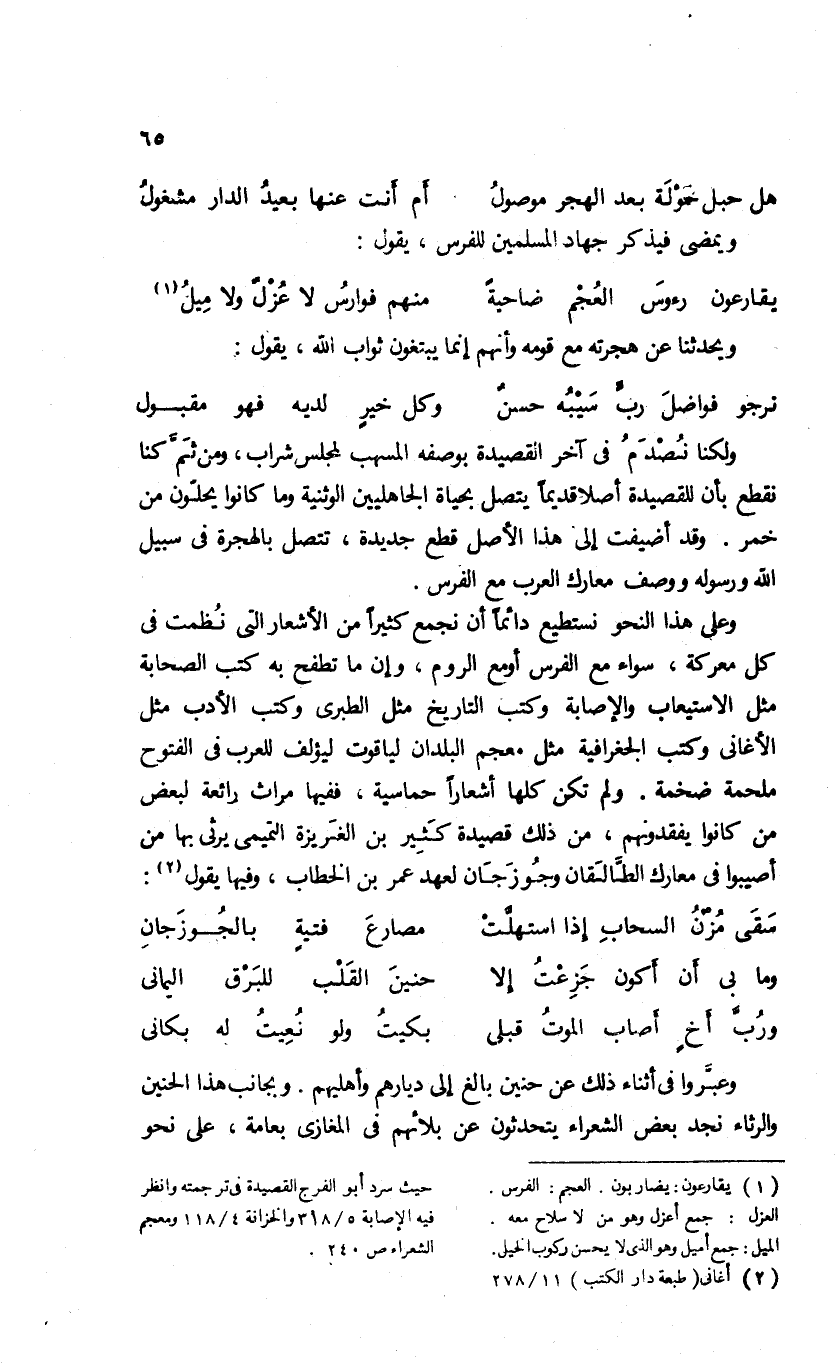 وعلى هذا النحو نستطيع دائما أن نجمع كثيرا من الأشعار التى نظمت فى كل معركة، سواء مع الفرس أو مع الروم، وإن ما تطفح به كتب الصحابة مثل الاستيعاب والإصابة وكتب التاريخ مثل الطبرى وكتب الأدب مثل الأغانى وكتب الجغرافية مثل معجم البلدان لياقوت ليؤلف للعرب فى الفتوح ملحمة ضخمة. ولم تكن كلها أشعارا حماسية، ففيها مراث رائعة لبعض من كانوا يفقدونهم، من ذلك قصيدة كثير بن الغريزة التميمى يرثى بها من أصيبوا فى معارك الطّالقان وجوزجان لعهد عمر بن الخطاب، وفيها يقول (¬2):