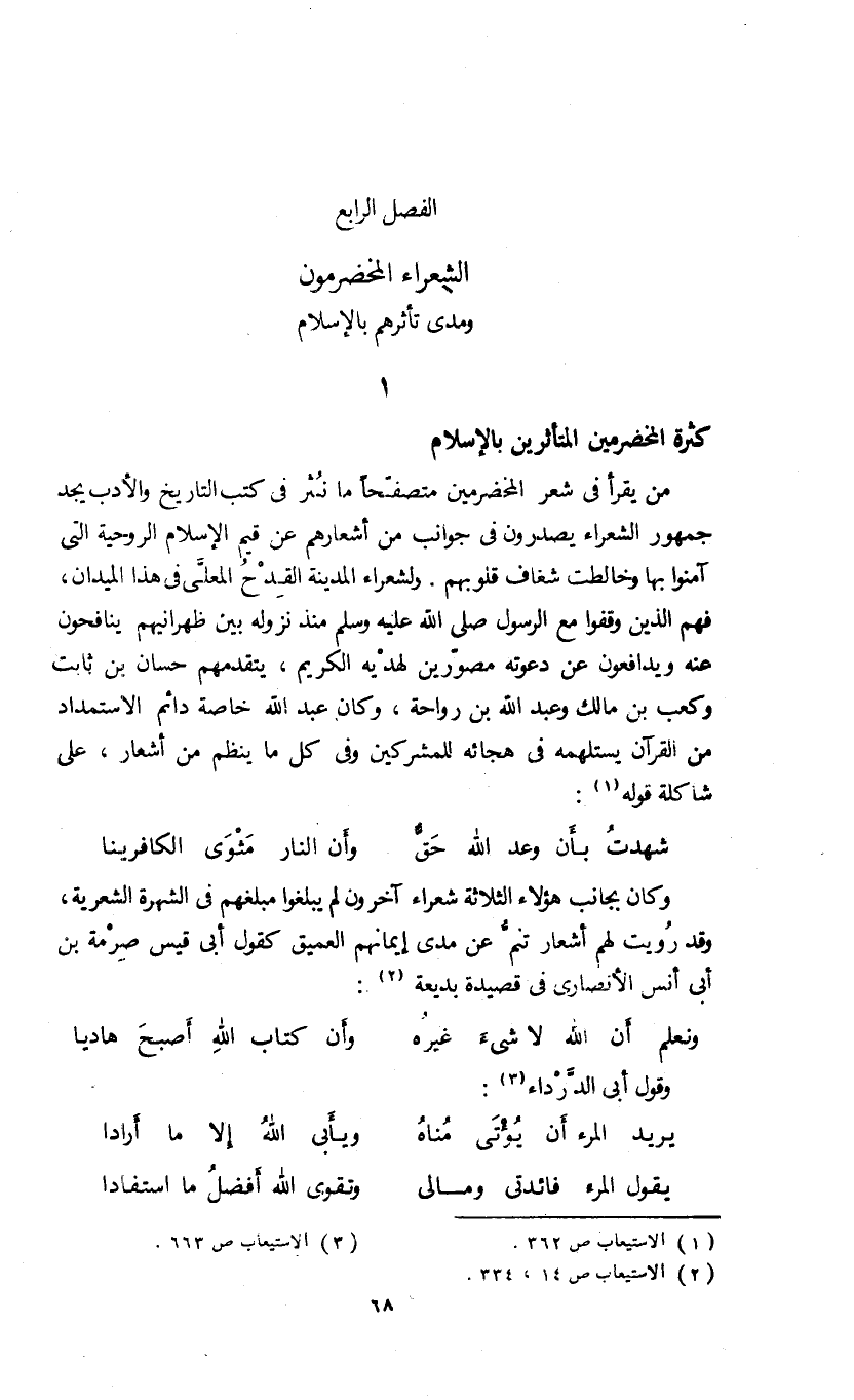 من يقرأ فى شعر المخضرمين متصفّحا ما نثر فى كتب التاريخ والأدب يجد جمهور الشعراء يصدرون فى جوانب من أشعارهم عن قيم الإسلام الروحية التى آمنوا بها وخالطت شغاف قلوبهم. ولشعراء المدينة القدح المعلّى فى هذا الميدان، فهم الذين وقفوا مع الرسول صلى الله عليه وسلم منذ نزوله بين ظهرانيهم ينافحون عنه ويدافعون عن دعوته مصوّرين لهديه الكريم، يتقدمهم حسان بن ثابت وكعب بن مالك وعبد الله بن رواحة، وكان عبد الله خاصة دائم الاستمداد من القرآن يستلهمه فى هجائه للمشركين وفى كل ما ينظم من أشعار، على شاكلة قوله (¬1):