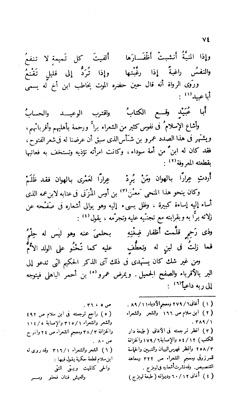 (¬6) الشعر والشعراء 1/ 316 وقد روى له ابن سلام قطعة حكمية يقول فيها: والحى كالميت ويبقى التقى والعيش فنان فحلو وبر