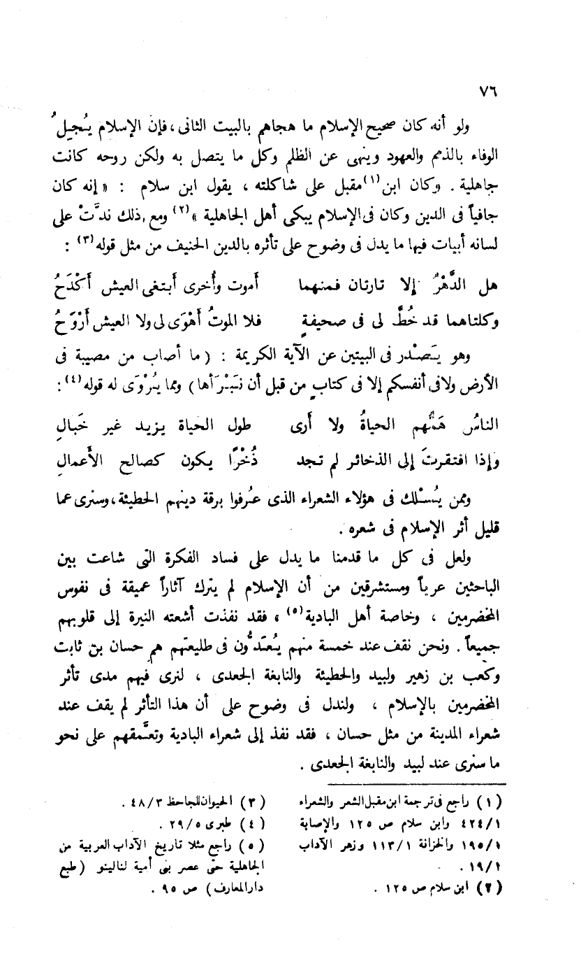 ولعل فى كل ما قدمنا ما يدل على فساد الفكرة التى شاعت بين الباحثين عربا ومستشرقين من أن الإسلام لم يترك آثارا عميقة فى نفوس المخضرمين، وخاصة أهل البادية (¬5)، فقد نفذت أشعته النيرة إلى قلوبهم جميعا. ونحن نقف عند خمسة منهم يعدّون فى طليعتهم هم حسان بن ثابت وكعب بن زهير ولبيد والحطيئة والنابغة الجعدى، لنرى فيهم مدى تأثر المخضرمين بالإسلام، ولندل فى وضوح على أن هذا التأثر لم يقف عند شعراء المدينة من مثل حسان، فقد نفذ إلى شعراء البادية وتعّمقهم على نحو ما سنرى عند لبيد والنابغة الجعدى.