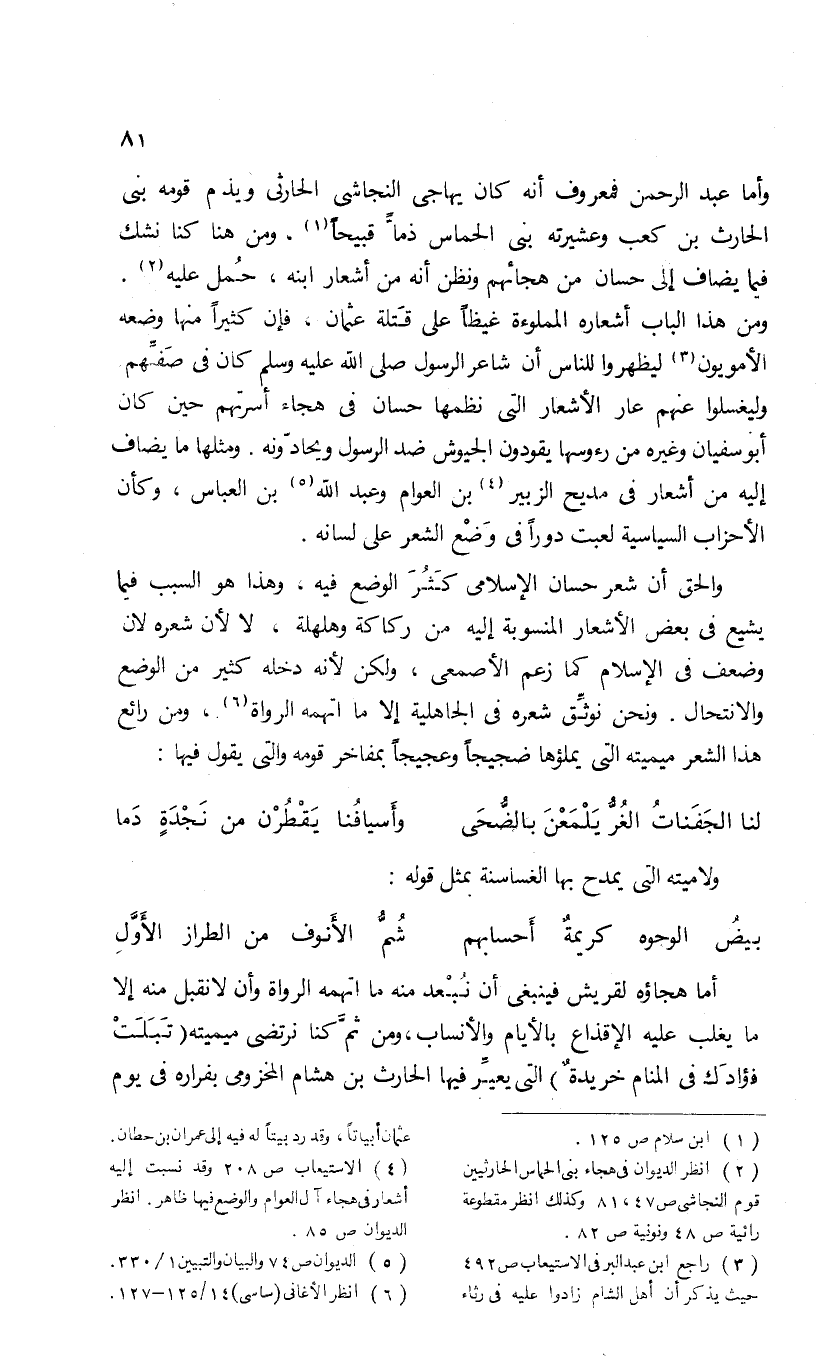 وأما عبد الرحمن فمعروف أنه كان يهاجى النجاشى الحارثى ويذم قومه بنى الحارث بن كعب وعشيرته بنى الحماس ذمّا قبيحا (¬1)، ومن هنا كنا نشك فيما يضاف إلى حسان من هجائهم ونظن أنه من أشعار ابنه، حمل عليه (¬2).