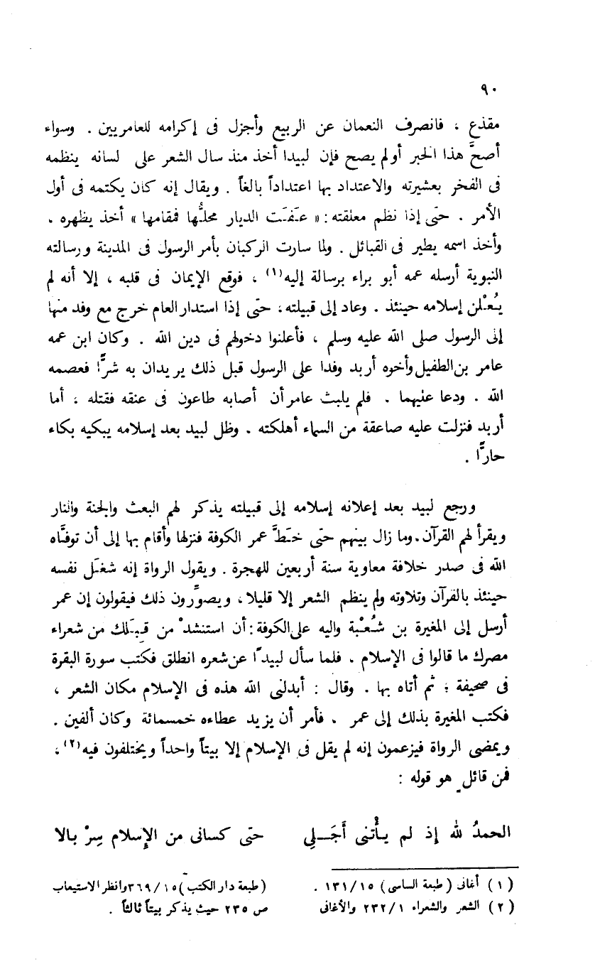 مقذع، فانصرف النعمان عن الربيع وأجزل فى إكرامه للعامريين. وسواء أصحّ هذا الخبر أو لم يصح فإن لبيدا أخذ منذ سال الشعر على لسانه ينظمه فى الفخر بعشيرته والاعتداد بها اعتدادا بالغا. ويقال إنه كان يكتمه فى أول الأمر. حتى إذا نظم معلقته: «عفت الديار محلّها فمقامها» أخذ يظهره، وأخذ اسمه يطير فى القبائل. ولما سارت الركبان بأمر الرسول فى المدينة ورسالته النبوية أرسله عمه أبو براء برسالة إليه (¬1)، فوقع الإيمان فى قلبه، إلا أنه لم يعلن إسلامه حينئذ. وعاد إلى قبيلته، حتى إذا استدار العام خرج مع وفد منها إلى الرسول صلى الله عليه وسلم، فأعلنوا دخولهم فى دين الله. وكان ابن عمه عامر بن الطفيل وأخوه أربد وفدا على الرسول قبل ذلك يريدان به شرّا فعصمه الله. ودعا عليهما، فلم يلبث عامر أن أصابه طاعون فى عنقه فقتله، أما أربد فنزلت عليه صاعقة من السماء أهلكته، وظل لبيد بعد إسلامه يبكيه بكاء حارّا.