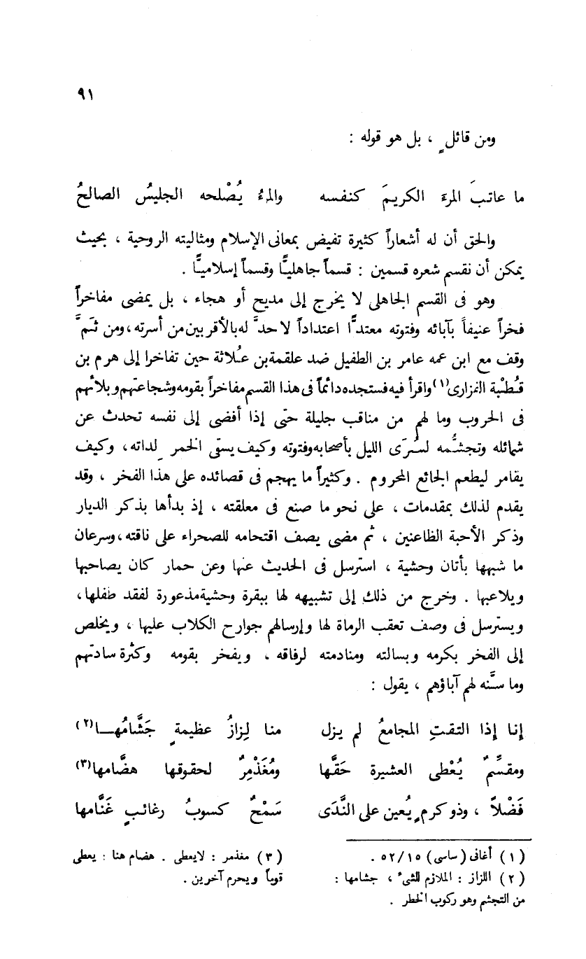 وهو فى القسم الجاهلى لا يخرج إلى مديح أو هجاء، بل يمضى مفاخرا فخرا عنيفا بآبائه وفتوته معتدّا اعتدادا لا حدّ له بالأقربين من أسرته، ومن ثمّ وقف مع ابن عمه عامر بن الطفيل ضد علقمة بن علاثة حين تفاخرا إلى هرم بن قطبة الفزارى (¬1) واقرأ فيه فستجده دائما فى هذا القسم مفاخرا بقومه وشجاعتهم وبلائهم فى الحروب وما لهم من مناقب جليلة حتى إذا أفضى إلى نفسه تحدث عن شمائله وتجشّمه لسرى الليل بأصحابه وفتوته وكيف يسقى الخمر لداته، وكيف يقامر ليطعم الجائع المحروم. وكثيرا ما يهجم فى قصائده على هذا الفخر، وقد يقدم لذلك بمقدمات، على نحو ما صنع فى معلقته، إذ بدأها بذكر الديار وذكر الأحبة الظاعنين، ثم مضى يصف اقتحامه للصحراء على ناقته، وسرعان ما شبهها بأتان وحشية، استرسل فى الحديث عنها وعن حمار كان يصاحبها ويلاعبها. وخرج من ذلك إلى تشبيهه لها ببقرة وحشية مذعورة لفقد طفلها، ويسترسل فى وصف تعقب الرماة لها وإرسالهم جوارح الكلاب عليها، ويخلص إلى الفخر بكرمه وبسالته ومنادمته لرفاقه. ويفخر بقومه وكثرة سادتهم وما سنّه لهم آباؤهم، يقول: