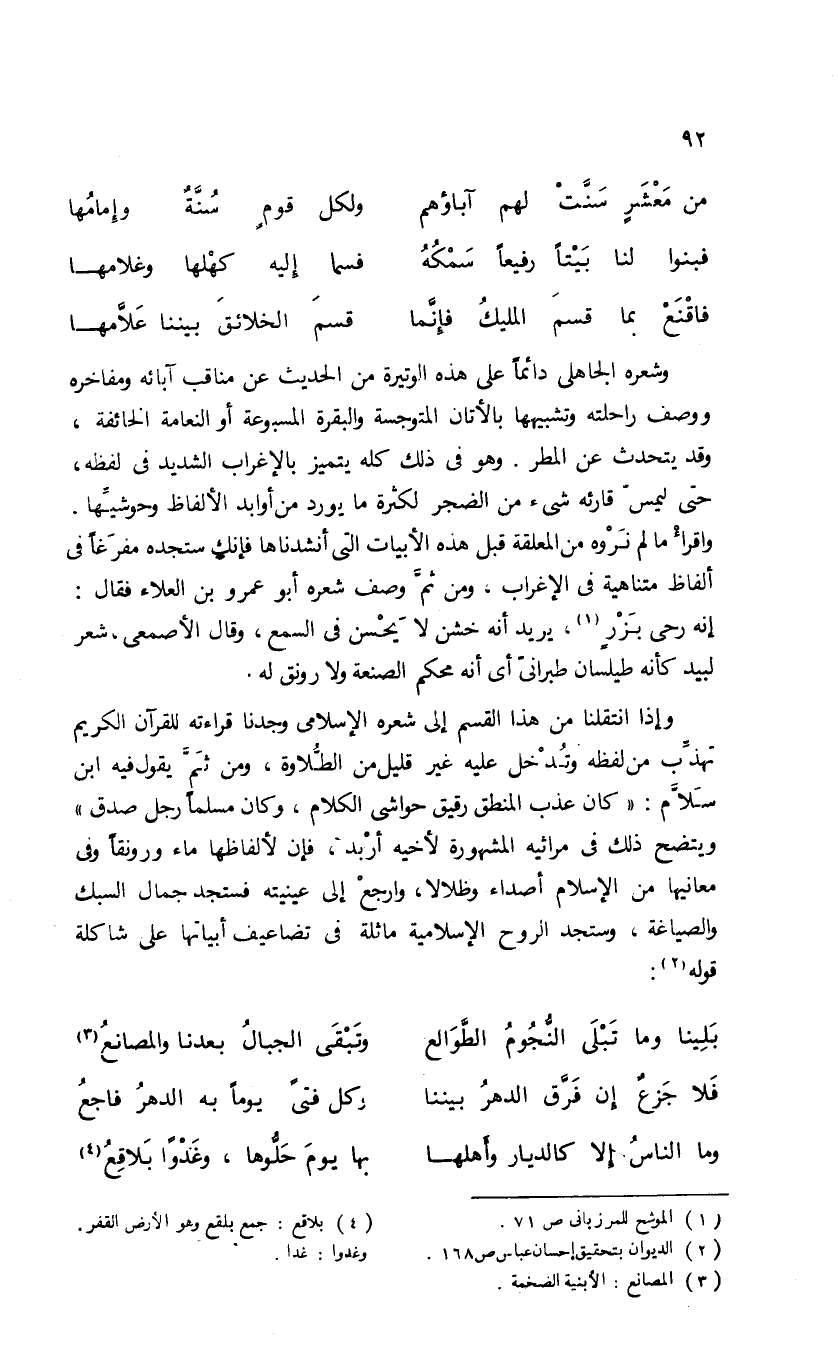 وإذا انتقلنا من هذا القسم إلى شعره الإسلامى وجدنا قراءته للقرآن الكريم تهذّب من لفظه وتدخل عليه غير قليل من الطّلاوة، ومن ثمّ يقول فيه ابن سلاّم: «كان عذب المنطق رقيق حواشى الكلام، وكان مسلما رجل صدق» ويتضح ذلك فى مراثيه المشهورة لأخيه أربد، فإن لألفاظها ماء ورونقا وفى معانيها من الإسلام أصداء وظلالا، وارجع إلى عينيته فستجد جمال السبك والصياغة، وستجد الروح الإسلامية ماثلة فى تضاعيف أبياتها على شاكلة قوله (¬2):