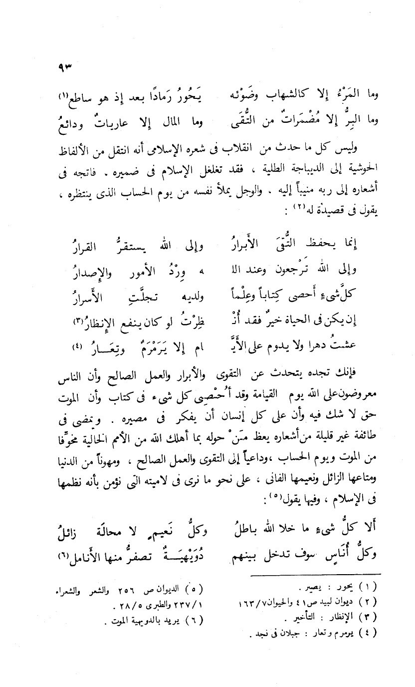 فإنك تجده يتحدث عن التقوى والأبرار والعمل الصالح وأن الناس معروضون على الله يوم القيامة وقد أحصى كل شئ فى كتاب وأن الموت حق لا شك فيه وأن على كل إنسان أن يفكر فى مصيره. ويمضى فى طائفة غير قليلة من أشعاره يعظ من حوله بما أهلك الله من الأمم الخالية مخوّفا من الموت ويوم الحساب، وداعيا إلى التقوى والعمل الصالح، ومهونا من الدنيا ومتاعها الزائل ونعيمها الفانى، على نحو ما نرى فى لاميته التى نؤمن بأنه نظمها فى الإسلام، وفيها يقول (¬5):