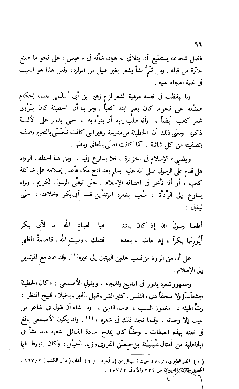 وجمهور شعره يدور فى المديح والهجاء، ويقول الأصمعى: «كان الحطيئة جشعا سؤولا ملحفا دنئ النفس، كثير الشر، قليل الخير، بخيلا، قبيح المنظر، رثّ الهيئة، مغموز النسب، فاسد الدين، وما تشاء أن تقول فى شاعر من عيب إلا وجدته، وقلما تجد ذلك فى شعره» (¬2). وقد يكون الأصمعى بالغ فى نعته بهذه الصفات، وحقّا كان يمدح سادة القبائل بشعره منذ نشأ فى الجاهلية من أمثال عيينة بن حصن الفزارى وزيد الخيل، وكان يتورط فيما