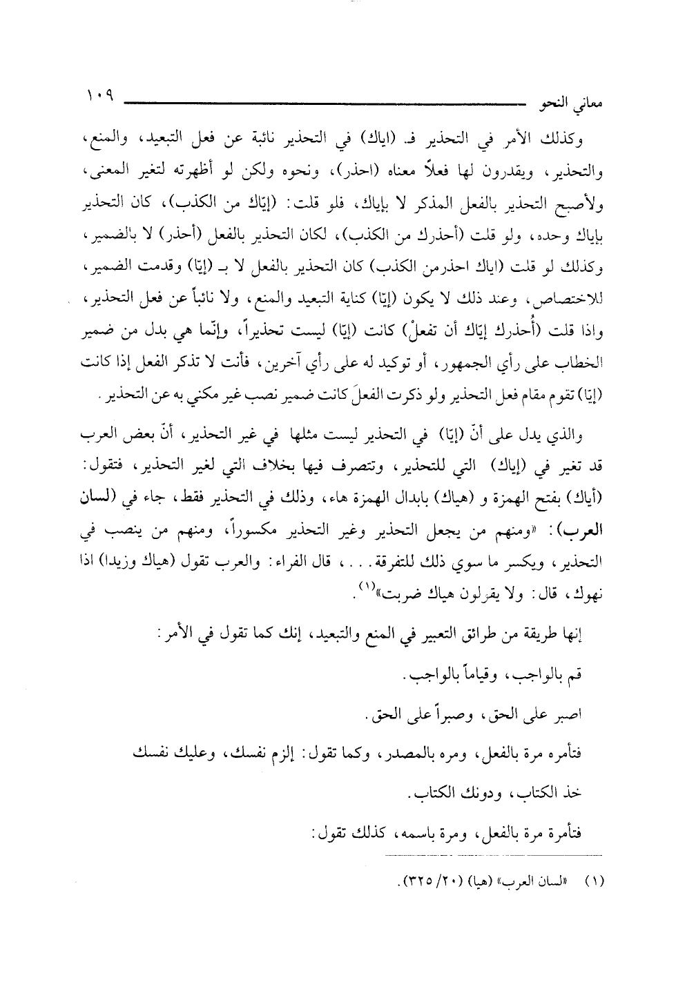وكذلك الأمر في التحذير فـ (إياك) في التحذير نائبة عن فعل التبعيد، والمنع، والتحذير ويقدرون لها فعلا معناه (احذر)، ونحو ولكن لو أظهرته لتغير المعنى، ولأصبح التحذير بالفعل المذكر لا بإياك، فلو قلت: (إياك من الكذب) كان التحذير بإياك وحده، ولو قلت (احذرك من الكذب) لكان التحذير بالفعل (احذر) لا بالضمير، وكذلك لو قلت (إياك احذر من الكذب) كان التحذير بالفعل لا بـ (إيا) وقدمت الضمير للاختصاص، وعند ذلك لا يكون (إيا) كناية التبعيد والمنع، ولا نائبا عن فعل التحذير، وإذا قلت (احذك إياك أن تفعل) كانت (إيا) ليست تحذيرا، وإنما هي بدل من ضمير الخطاب على رأي الجمهور، أو توكيد له على رأي آخرين، فأنت لا تذكر الفعل إذا كانت (إيا) تقوم مقام فعل التحذير ولو ذكرت الفعل كانت ضمير نصب غير مكني به عن التحذير.