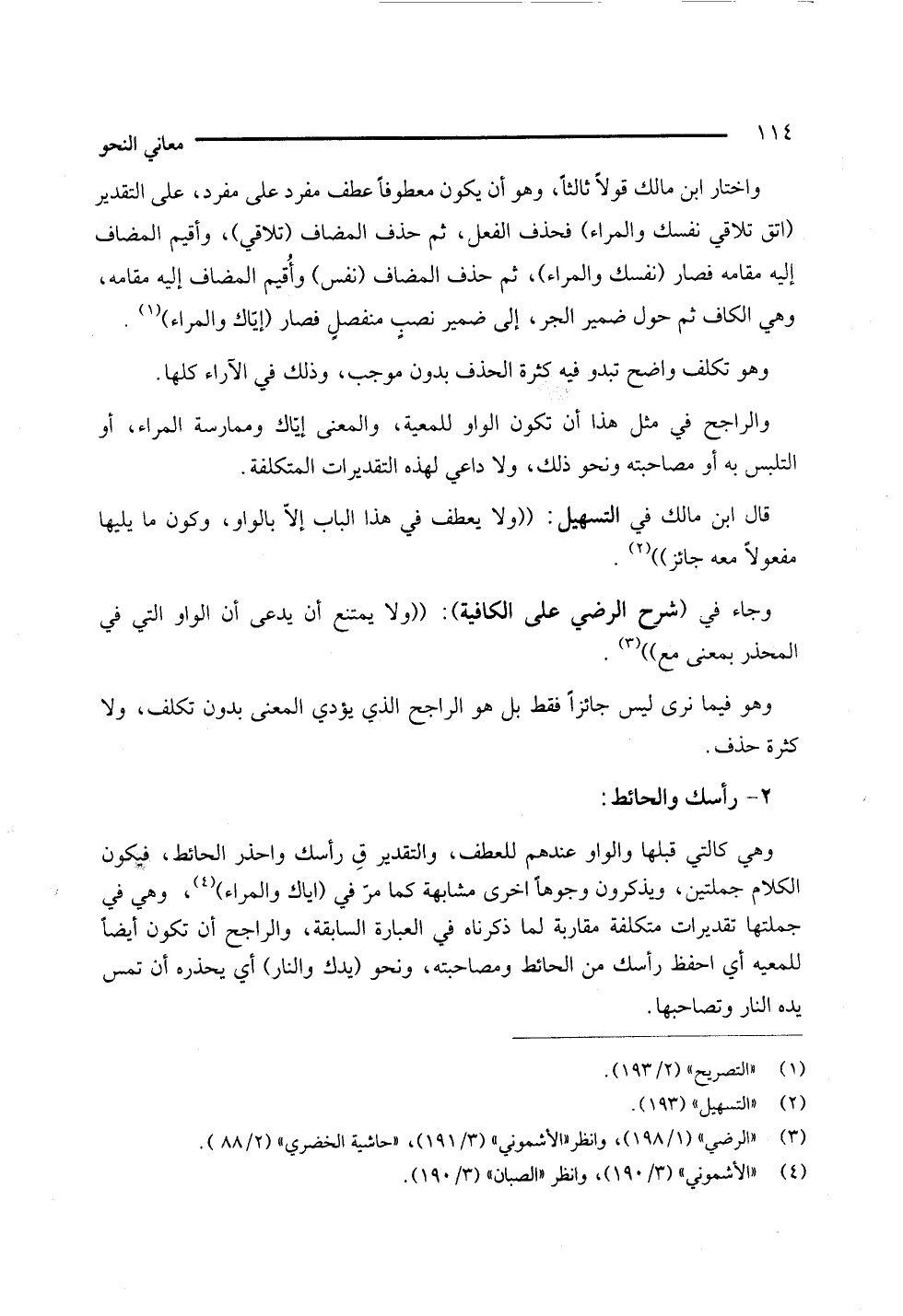 واختار ابن مالك قولا ثالثا، وهو أن يكون معطوفا، عطف مفرد على مفرد، على التقدير (اتق تلاقي نفسك والمراء) فحذف الفعل، ثم حذف المضاف (تلاقي)، وأقيم المضاف إليه مقامه فصار (نفسك والمراء) ثم حذف المضاف (نفس) واقيم المضاف إليه مقامه، وهي الكاف ثم حول ضمير الجر، إلى ضمير نصب منفصل فصار (إياك والمراء) (¬1).