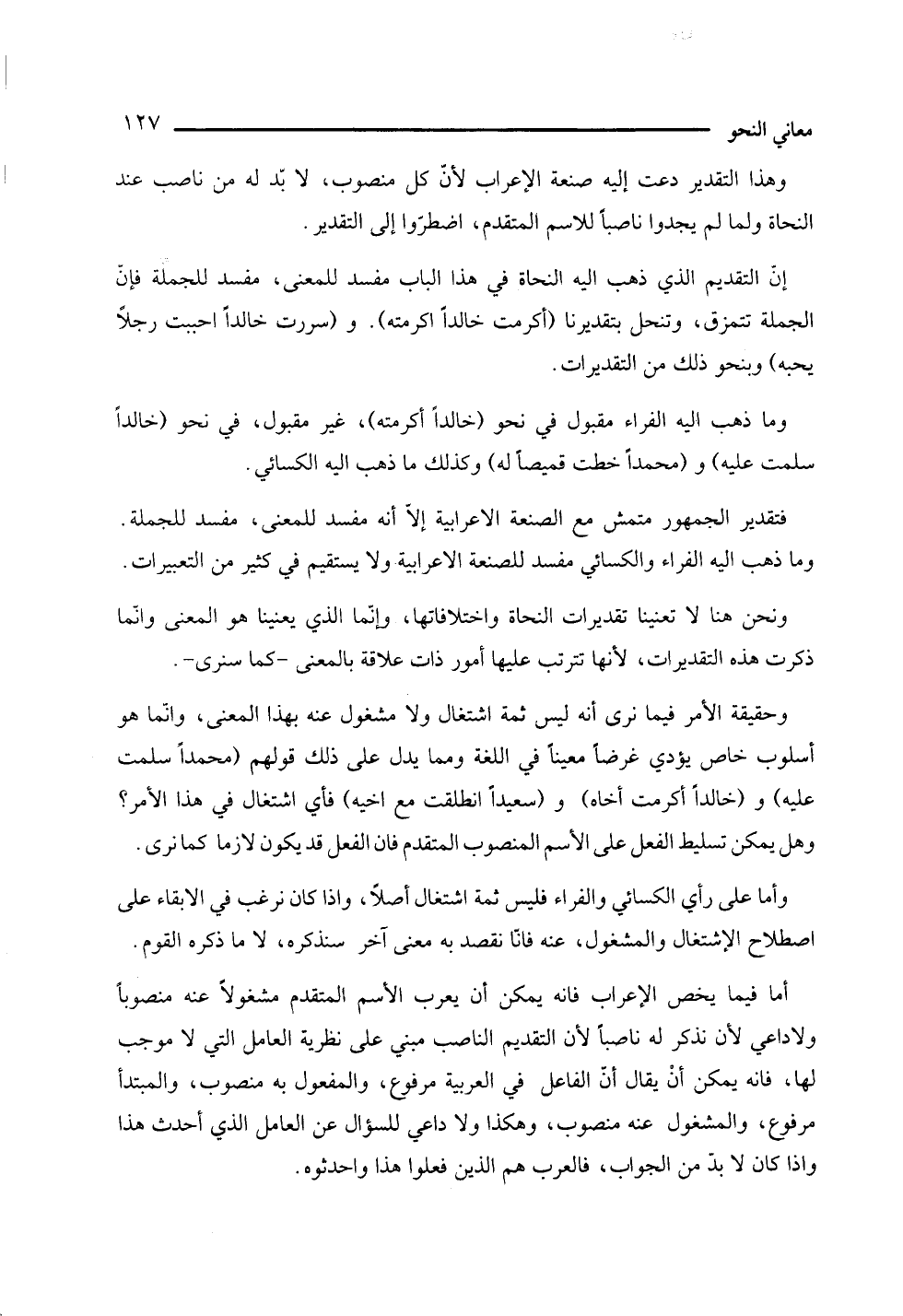 إن التقديم الذي ذهب إليه النحاة في هذا الباب مفسد للمعنى، مفسد للجملة فإن الجملة تتمزق، وتنحل بتقديرنا (أكرمت خالدا أكرمته)، و (سررت خالدا أحببت رجلا يحبه) وبنحو ذلك من التقديرات.