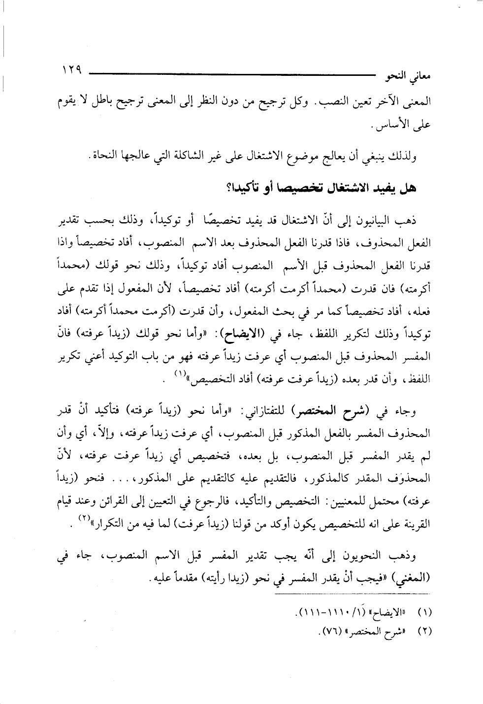 وجاء في (شرح المختصر) للتفتازاني: " وأما نحو (زيدا عرفته) فتأكيد أن قدر المحذوف المفسر بالفعل المذكور قبل المنصوب، أي عرفت زيدا عرفته، وإلا أي وأن لم يقدر المفسر قبل المنصوب، بل بعده فتخصيص أي زيدا عرفت عرفته، لأن المحذوف المقدر كالمذكور، فالتقديم عليه كالتقديم على المذكور .. فنحو (زيدا عرفته) محتمل للمعنيين: التخصيص والتأكيد، فالرجوع في التعيين إلى القرائن وعند قيام القرينة على أنه للتخصيص يكون أوكد من قولنا (زيدا عرفت) لما فيه من التكرار" (¬2).
