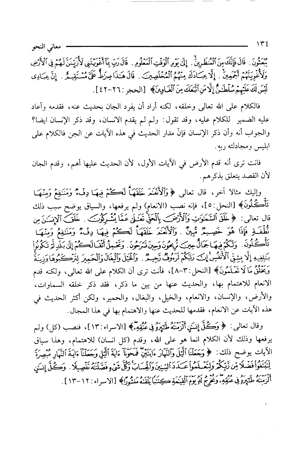 وقال تعالى: {وكل إنسان ألزمناه طائره في عنقه} [الإسراء: 13]، فنصب (كل) ولم يرفعها وذلك لأن الكلام إنما هو على الله، وقدم (كل إنسان) للاهتمام، وهذا سياق الآيات يوضح ذلك: {وجعلنا الليل والنهار آيتين فمحونا آية الليل وجعلنا آية النهار مبصرة لتبتغوا فضلا من ربكم ولتعلموا عدد السنين والحساب وكل شيء فصلناه تفصيلا. وكل إنسان ألزمناه طائره في عنقه ونخرج له يوم القيامة كتابا يلقاه منشورا} [الإسراء: 12 - 13].