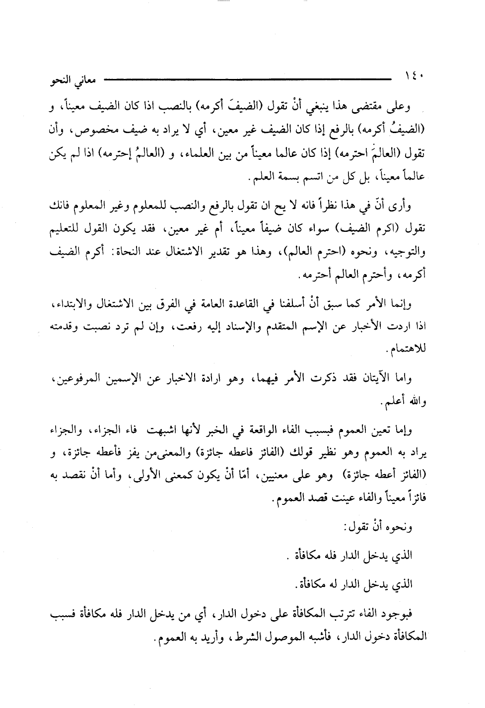 وأرى أن في هذا نظرا فإنه لا يح أن تقول بالرفع والنصب للمعلوم وغير المعلوم فإنك تقول (أكرم الضيف) سواء كان ضيفا معينا، أم غير معين، فقد يكون القول للتعليم والتوجيه، ونحوه (احترم العالم) وهذا هو تقدير الاشتغال عند النحاة: أكرم الضيف أكرمه، وأحترم العالم أحترمه.