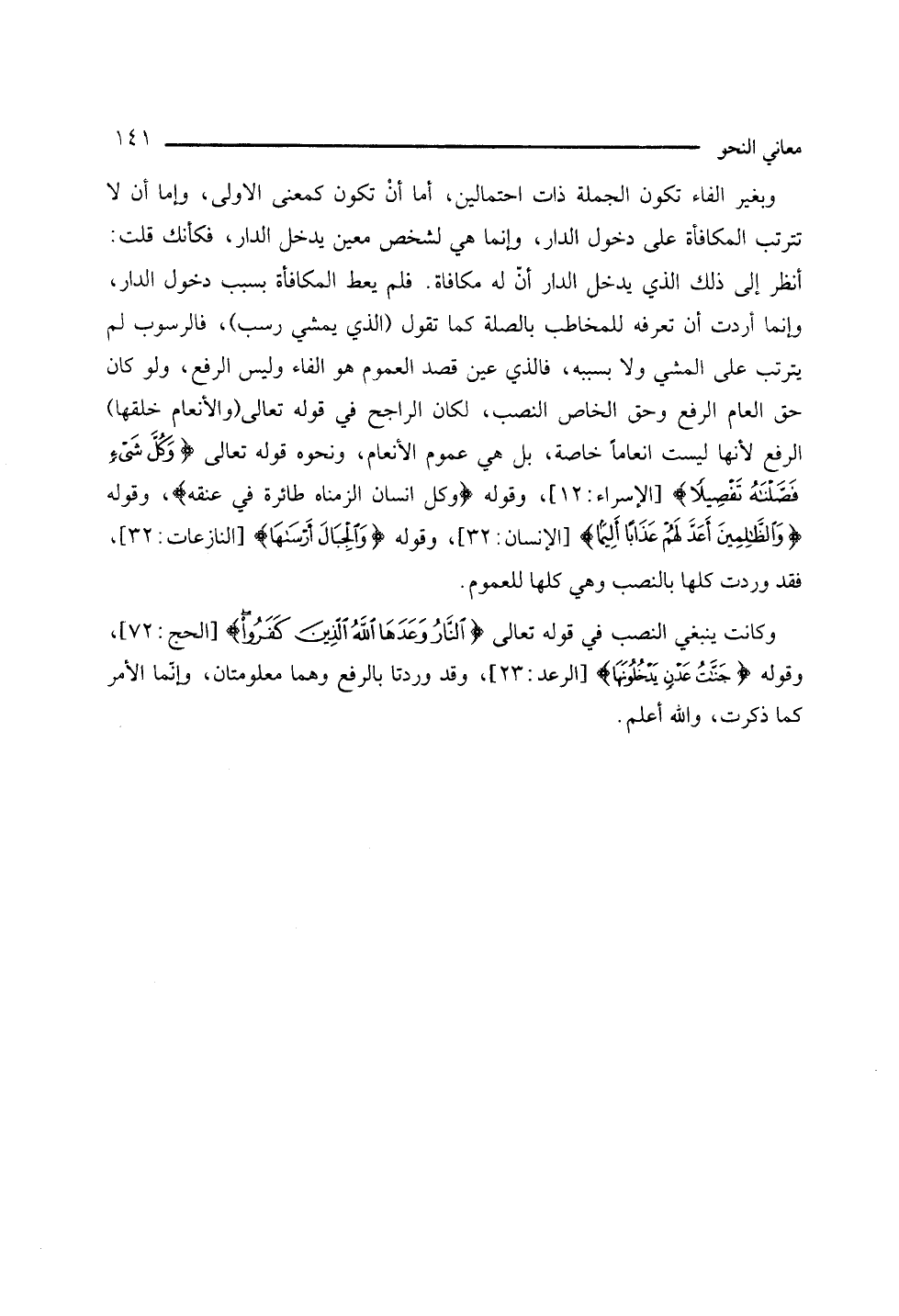 وبغير الفاء تكون الجملة ذات احتمالين أما أن تكون كمعنى الأولى، وإما أن لا تترتب المكافأة على دخول الدار، وإنما هي لشخص معين يدخل الدار، فكأنك قلت: انظر إلى ذلك الذي يدخل الدار أن له مكافأة، فلم يعط الكافأة بسبب دخول الدار، وإنما أردت أن تعرفه للمخاطب بالصلة كما تقول (الذي يمسى رسب) فالرسوب لم يترتب على المشي ولا بسببه، فالذي عين قصد العموم هو الفاء وليس الرفع، ولو كان حق العام الرفع وحق الخاص النصب، لكان الراجح في قوله تعالى (والأنعام خلقها) الرفع لأنها ليست إنعاما خاصة، بل هي عموم الأنعام، ونحوه قوله تعالى {وكل شيء فصلناه تفصيلا} [الإسراء: 12]، وقوله: {وكل إنسان ألزمناه طائره في عنقه}، وقوله: {والظالمين أعد لهم عذابا أليما} [الإنسان: 32]، وقوله {والجبال أرساها} [النازعات: 32]، فقد وردت كلها بالنصب وهي كلها للعموم.