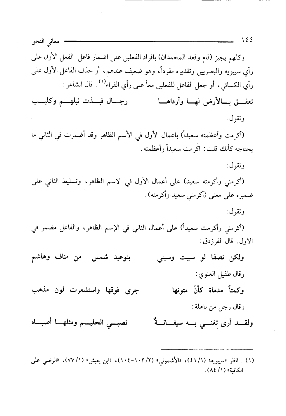وكلهم يجيز (قام وقعد المحمدان) بإفراد الفعلين على إضمار فاعل الفعل الأول على رأي سيبويه والبصريين وتقديره مفردا، وهو ضعيف عندهم، أو حذف الفاعل الول على رأي الكسائي، أو جعل الفاعل للفعلين معا على رأي الفراء (¬1). قال الشاعر: