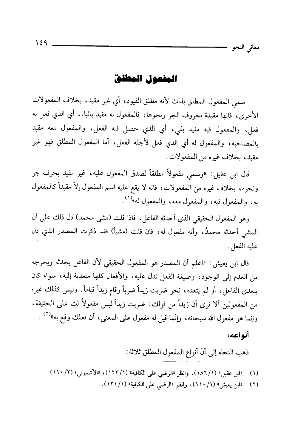 وهو الفعول الحقيقي الذي أحدثه الفاعل، فإذا قلت (مشى محمد) دل ذلك على أن المشي أحدثه محمد، وأنه مفعول له، فأن قلت (مشيا) فقد ذكرت المصدر الذي دل عليه الفعل.