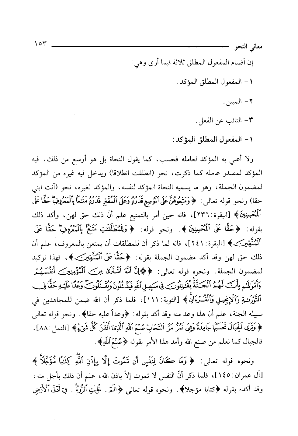 ولا أعني به المؤكد لعامله فحسب، كما يقول النحاة بل هو اوسع من ذلك، فيه المؤكد لمصدر عامله كما ذكرت، نحو (انطلقت انطلاقا) ويدخل فيه غيره من المؤكد لمضمون الجملة، وهو ما يسميه النحاة المؤكد لنفسه، والمؤكد لغيره، نحو (أنت ابني حقا) ونحو قوله تعالى: {ومتعوهن على الموسع قدره وعلى المقتر قدره متعا بالمعروف حقا على المحسنين} [البقرة: 236]، فإنه حين أمر بالتمتيع علم أن ذلك حق لهن، وأكد ذلك بقوله: {حقا على المحسنين}. ونحو قوله: {وللمطلقات متاع بالمعروف حقا على المتقين} [البقرة: 241]، فإنه لما ذكر أن للمطلقات أن يمتعن بالمعروف، علم أن ذلك حق لهن وقد اكد مضمون الجملة بقوله: {حقا على المتقين} فهذا توكيد لمضمون الجملة، ونحوه قوله تعالى: {إن الله اشترى من المؤمنين أنفسهم وأموالهم بأن لهم الجنة يقاتلون في سبيل الله فيقتلون ويقتلون وعدا عليه حقا في التوراة والإنجيل والقرءان} [التوبة: 111]، فلما ذكر ان الله ضمن للمجاهدين في سبيله الجنة، علم أن هذا وعد منه وقد اكد بقوله: {وعدا عليه حقا}، ونحو قوله تعالى: {وترى الجبال تحسبها جامدة وهي تمر مر السحاب صنع الله الذي أتقن كل شيء} [النمل: 88]، فالجبال كما نعلم من صنع الله وأمد هذا الأمر بقوله: {صنع الله}.