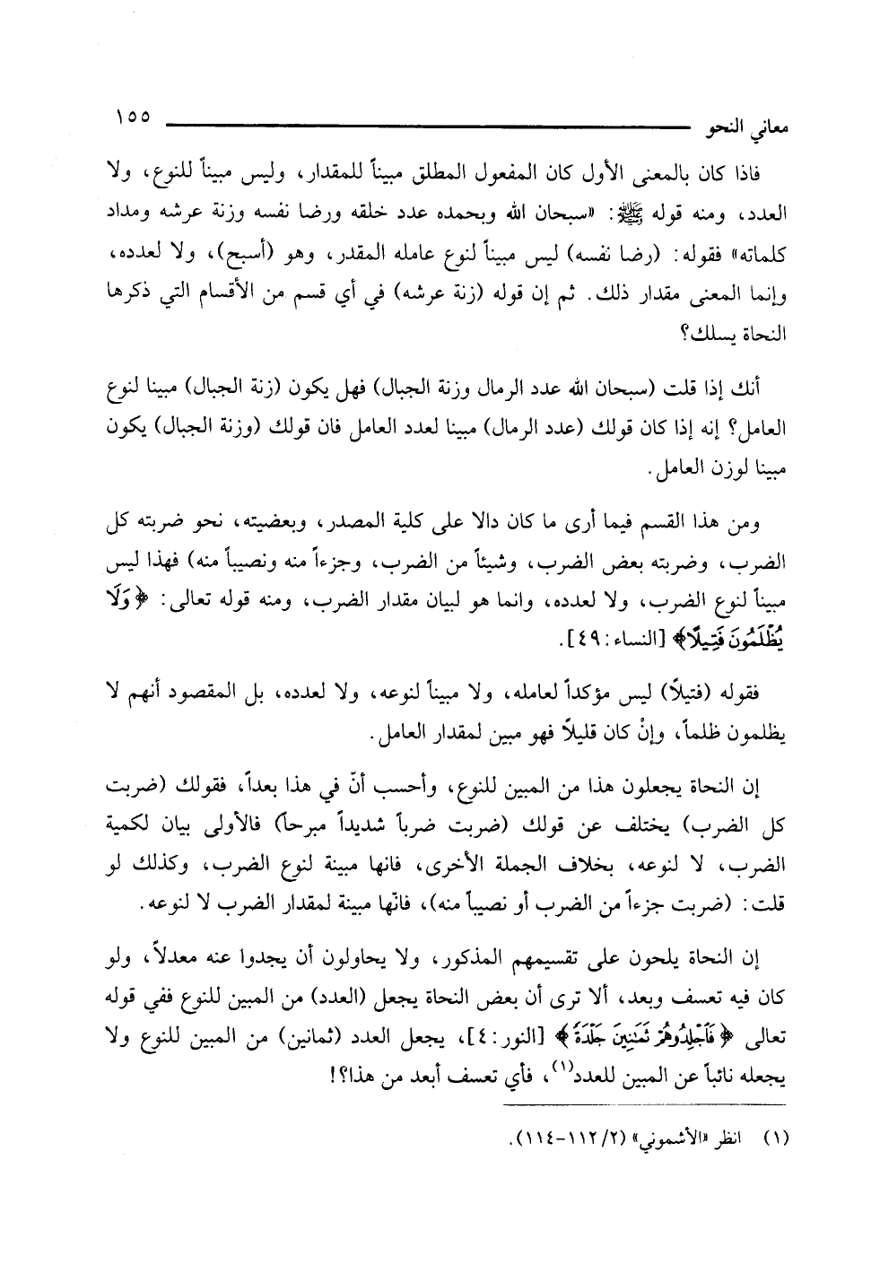 فإذا كان بالمعنى الأول كان المفعول المطلق مبينا للمقدار، وليس مبينا للنوع، ولا العدد، ومنه قوله صلى الله عليه وسلم: " سبحان الله وبحمده عدد خلقه ورضا نفسه وزنة عرشه ومداد كلماته" فقوله: (رضا نفسه) ليس مبينا لنوع عامله المقدر، وهو (اسبح)، ولا لعدده، وإنما المعنى مقدار ذلك. ثم إن قوله (زنة عرشة) في أي قسم من الأقسام التي ذكرها النحاة يسلك؟