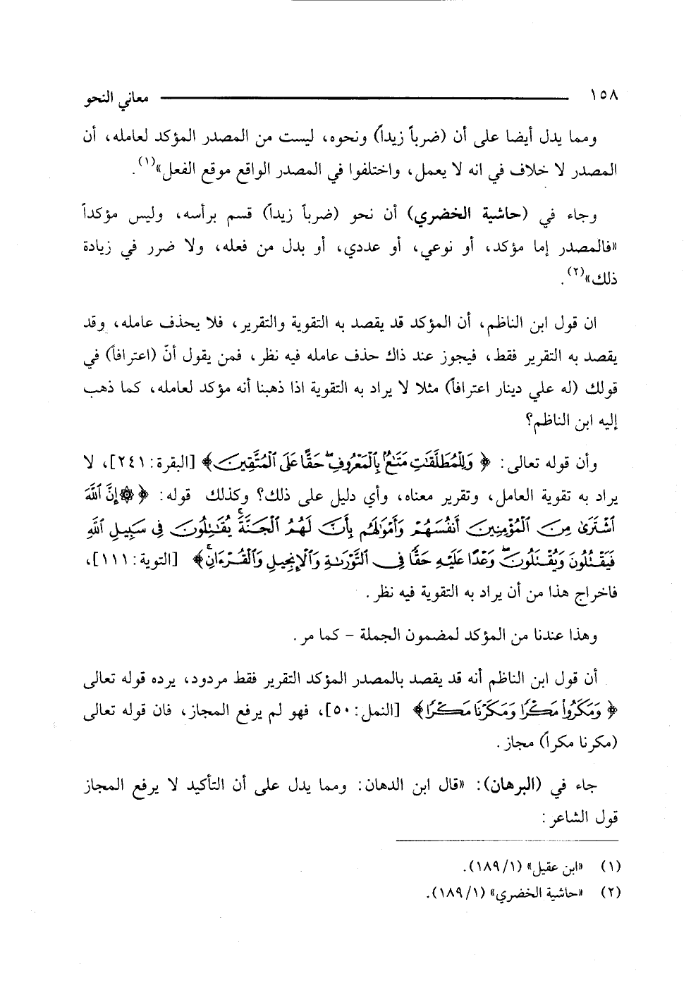 وجاء في (حاشية الخضري) ان نحو (ضربا زيدا) قسم برأسه، وليس مؤكدا " فالمصدر إما مؤكد، او نوعي أو عددي، أو بدل من فعله، ولا ضرر في زيادة ذلك" (¬2).