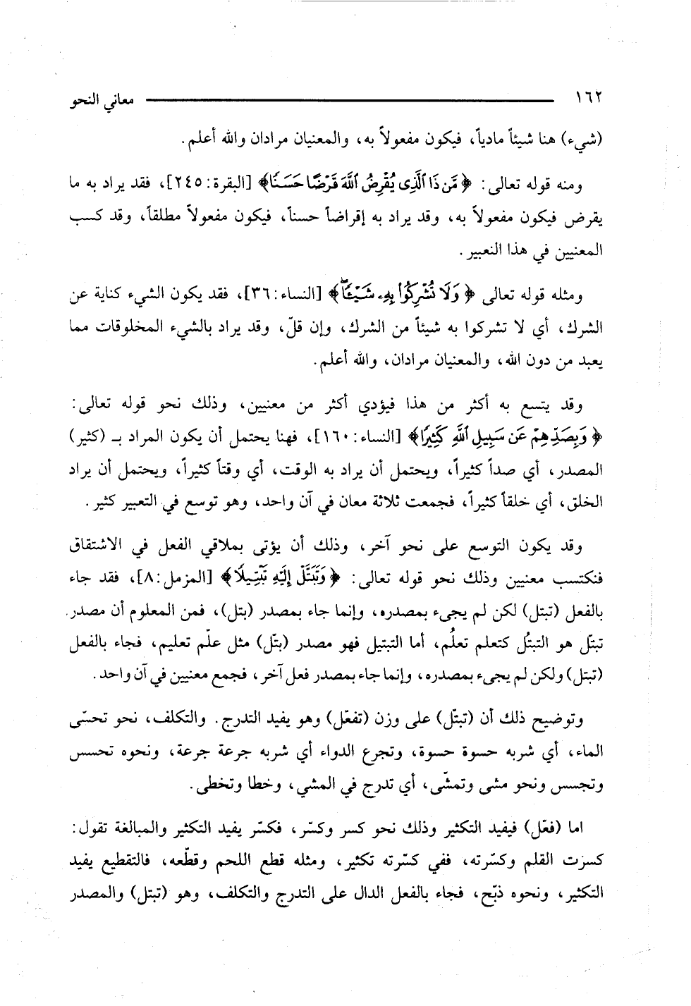 وقد يتسع به أكثر من هذا فيؤدي أكثر من معنيين، وذلك نحو قوله تعالى: {وبصدهم عن سبيل الله كثيرا} [النساء: 160]، فهنا يحتمل أن يكون المراد بـ (كثير) المصدر أي صدا كثيرا، ويحتمل أن يراد به الوقت، أي وقتا كثيرا، ويحتمل أن يراد الخلق أي خلقا كثيرا، فجمعت ثلاثة معان في آن واحد، وهو توسع في التعبير كثير.
