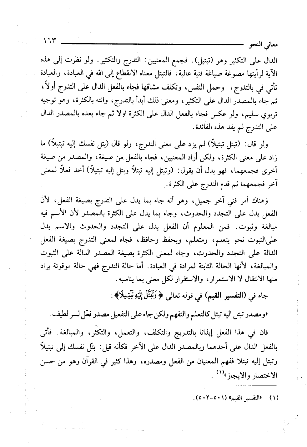 ولو قال: (تبتل تبتيلا) لم يزد على معنى التدرج، ولو قال (بتل نفسك إليه تبتيلا) ما زاد على معنى الكثرة، ولكن اراد المعنيين فجاء بالفعل من صيغة، والمصدر من صيغة أخرى فجمعهما، فهو بدل أن يقول: (وتبتل إليه تبتلا وبتل إليه تبتيلا) أخذ فعلا لمعنى آخر فجمعهما ثم قدم التدرج على الكثرة.