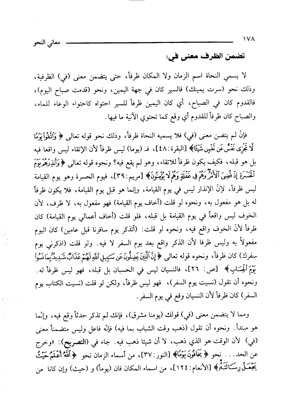 فإن لم يتضمن معنى (في) فلا يسميه النحاة ظرفا وذلك نحو قوله تعالى {واتقوا يوما لا تجزي نفس عن نفس شيئا} [البقرة: 48]، فـ (يوما) ليس ظرفا لأن الإتقاء ليس واقعا فيه بل هو قبله، فكيف يكون ظرفا للاتقاء، وهو لم يقع فيه؟ ونحوه قوله تعالى: {وأنذرهم يوم الحسرة إذ قضى الأمر وهم في غفلة وهم لا يؤمنون} [مريم: 39]، فيوم الحسرة وهو يوم القيامة ليس ظرفا، لأن الإنذار ليس في يوم القيامة، وإنما هو قبل يوم القيامة، فلا يكون ظرفا له بل هو مفعول به، ونحوه لو قلت (أخاف يوم القيامة) فهو مفعول به، لا ظرف، لأن الخوف ليس واقعا في يوم القيامة بل قبله، فلو قلت (أخاف أعمالي يوم القيامة) كان ظرفا لأن الخوف واقع فيه، ونحوه لو قلت: (أتذكر يوم سافرنا قبل عامين) كان اليوم مفعولا به وليس ظرفا لأن الذكر واقع بعد يوم السفر لا فيه. ولو قلت (اذكرني يوم سفرك) كان ظرفا، ونحوه قوله تعالى: {إن الذين يضلون عن سبيل الله لهم عذاب شديد بما نسوا يوم الحساب} [ص: 26]، فالنسيان ليس في الحسبان بل قبله، فهو ليس ظرفا له. ونحوه أن تقول (نسيت يوم السفر)، فهو ليس ظرفا، ولكن لو قلت (نسيت الكتاب يوم السفر) كان ظرفا لأن النسيان وقع في يوم السفر.