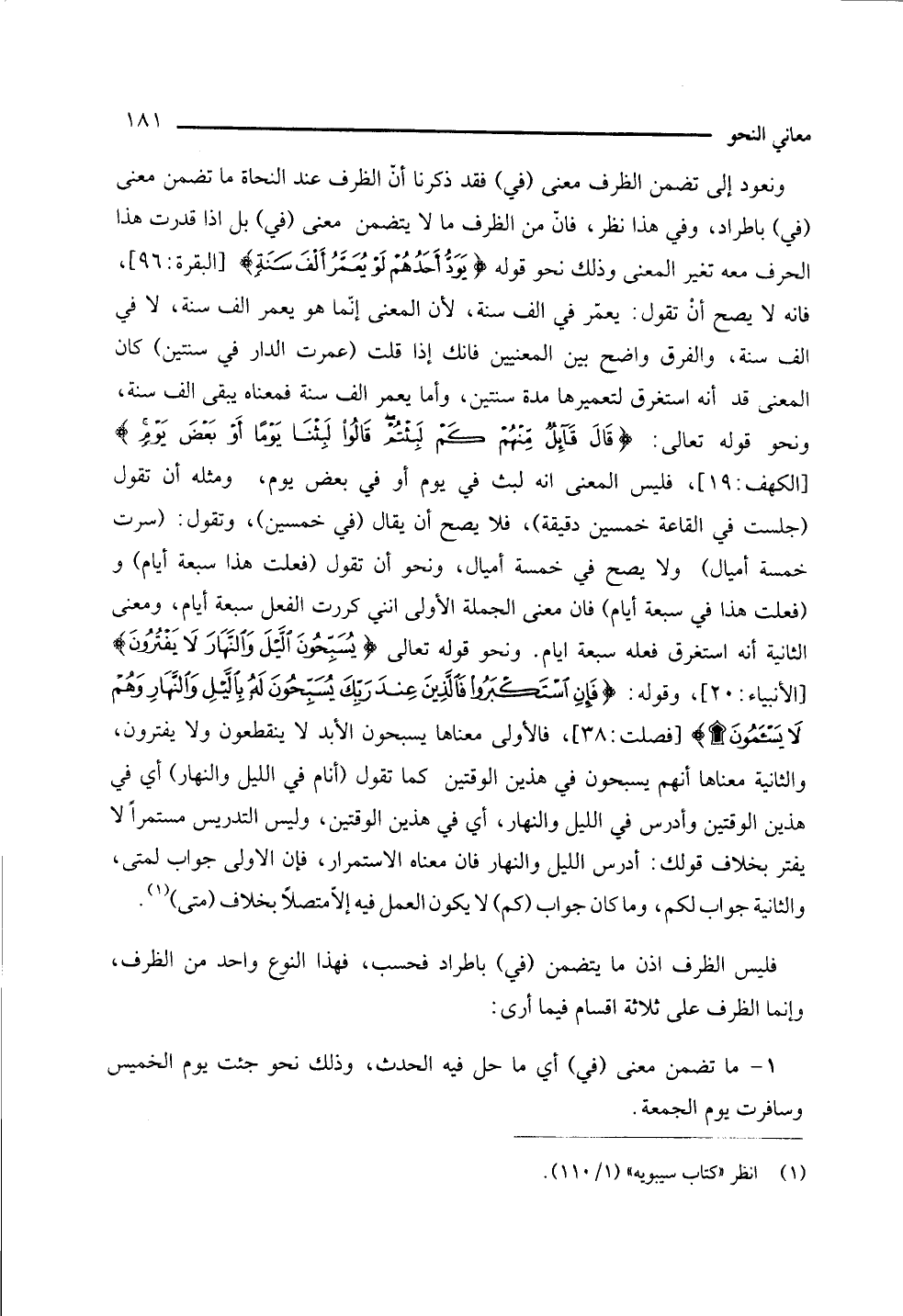 ونعود إلى تضمن الظرف معنى (في) فقد ذكرنا أن الظرف عند النحاة ما تضمن معنى (في) باطراد، وفي هذا نظر، فإن من الظرف ما لا يتضمن معنى (في) بل إذا قدرت هذا الحرف معه تغير المعنى وذلك نحو قوله: {يود أحدهم لو يعمر ألف سنة} [البقرة: 96]، فإنه لا يصح أن تقول: يعمر في ألف سنة، لأن المعنى إنما هو يعمر ألف سنة، لا في ألف سنة، والفرق واضح بين المعنيين فإنك إذا قلت (عمرت الدار في سنتين) كان المعنى قد أنه استغرق لتعميرها مدة سنتين، وأما يعمر ألف سنة فمعناه يبقى ألف سنة، ونحو قوله تعالى: {قال قائل منهم كم لبثم قالوا لبثنا يوما او بعض يوم} [الكهف: 19]، فليس المعنى أنه لبث في يوم أو في بعض يوم، ومثله أن تقول (جلست في القاعة خمسين دقيقة) فلا يصح أن يقال (في خمسين) وتقول: (سرت خمسة أميال) ولا يصح في خمسة اميال، ونحو أن تقول (فعلت هذا سبعة أيام) و (فعلت هذا في سبعة أيام) فإن معنى الجملة الأولى انني كررت الفعل سبعة أيام، ومعنى الثانية انه استغرق فعله سبعة أيام. ونحو قوله تعالى: {يسبحون الليل والنهار لا يفترون} [الأنبياء: : 20]، وقوله: {فإن استكبروا فالذين عند ربك يسبحون له بالليل والنهار وهم لا يسئمون} [فصلت 38]، فالأولى معناها يسبحون الأبد لا ينقطعون ولا يفترون، والثانية معناها أنهم يسبحون في هذين الوقتين كما تقول (أنام في الليل والنهار) أي في هذين الوقتين وأدرس في الليل والنهار، أي في هذين الوقتين، وليس التدريس مستمرا لا يفتر بحلاف قولك: أدرس الليل والنهار، فإن معناه الاستمرار، فإن الأولى جواب لمتى، والثانية جواب لكم، وما كان جواب (كم) لا يكون العمل فيه إلا متصلا بخلاف (متى) (¬1).