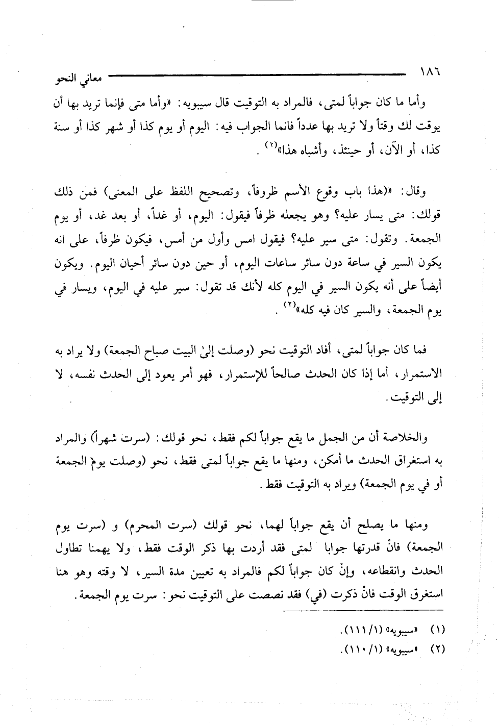 وقال: " هذا باب وقوع الاسم ظروفا، وتصحيح اللفظ على المعنى، فمن ذلك قولك: متى يسار عليه؟ وهو يجعله ظرفا فيقول: اليوم، او غدا، أو بعد غدا، أو يوم الجعة: وتقول: متى سير عليه؟ فيقول أمس وأول من أمس، فيكون ظرفا، على أنه يكون السير في ساعة دون سائر ساعات اليوم، أو حين دون سائر أحيان اليوم. ويكون أيضا على أنه يكون السير في اليوم كله لأنك قد تقول: سير عليه في اليوم، ويسار في يوم الجمعة، والسير كان فيه كله" (¬2).