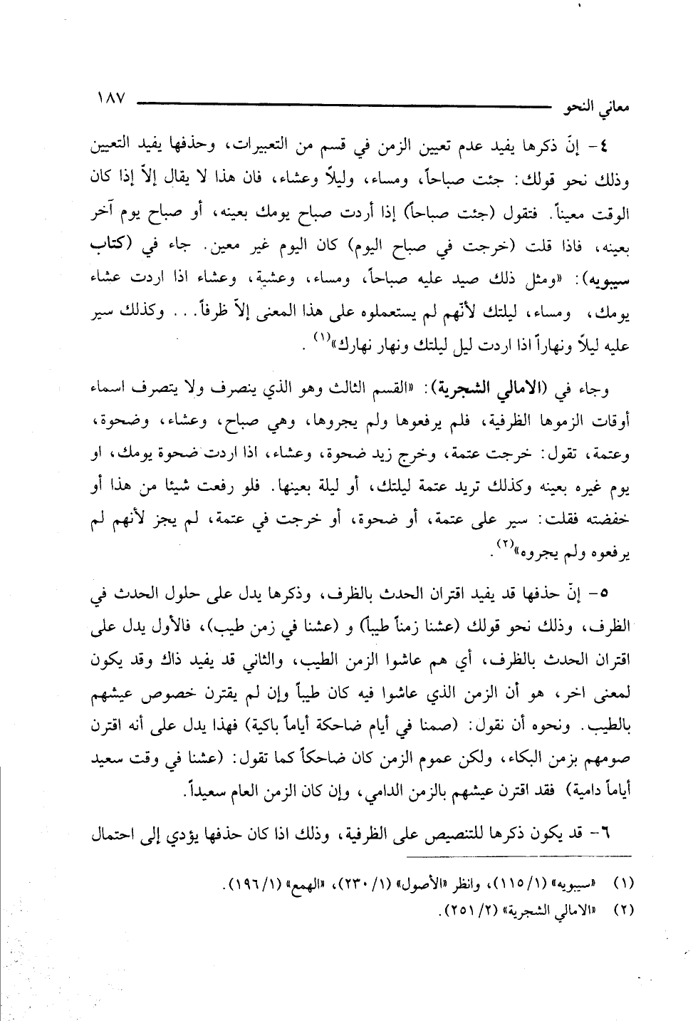 4 - إن ذكرها يفيد عدم تعيين الزمن في قسم من التعبيرات، وحذفها يفيد التعيين وذلك نحو قولك: جئت صباحا، ومساء، وليلا وعشاء، فإن هذا لا يقال إلا إذا كان الوقت معينا. فتقول (جئت صباحا) إذا أردت صباح يومك بعينه، أو صباح يوم آخر بعينه، فإذا قلت (خرجت في صباح اليوم) كان اليوم غير معين. جاء في (كتاب سيبويه): " ومثل ذلك صيد عليه صباحًا، ومساء، وعشية، وعشاء إذا أردت عشاء يومك، ومساء، ليلتك لأنهم لم يستعملوه على هذا المعنى إلا ظرفا .. وكذلك سير عليه ليلا ونهارا إذا أردت ليل ليلتك ونهار نهارك" (¬1).